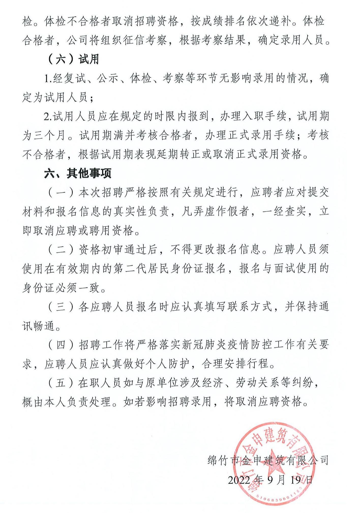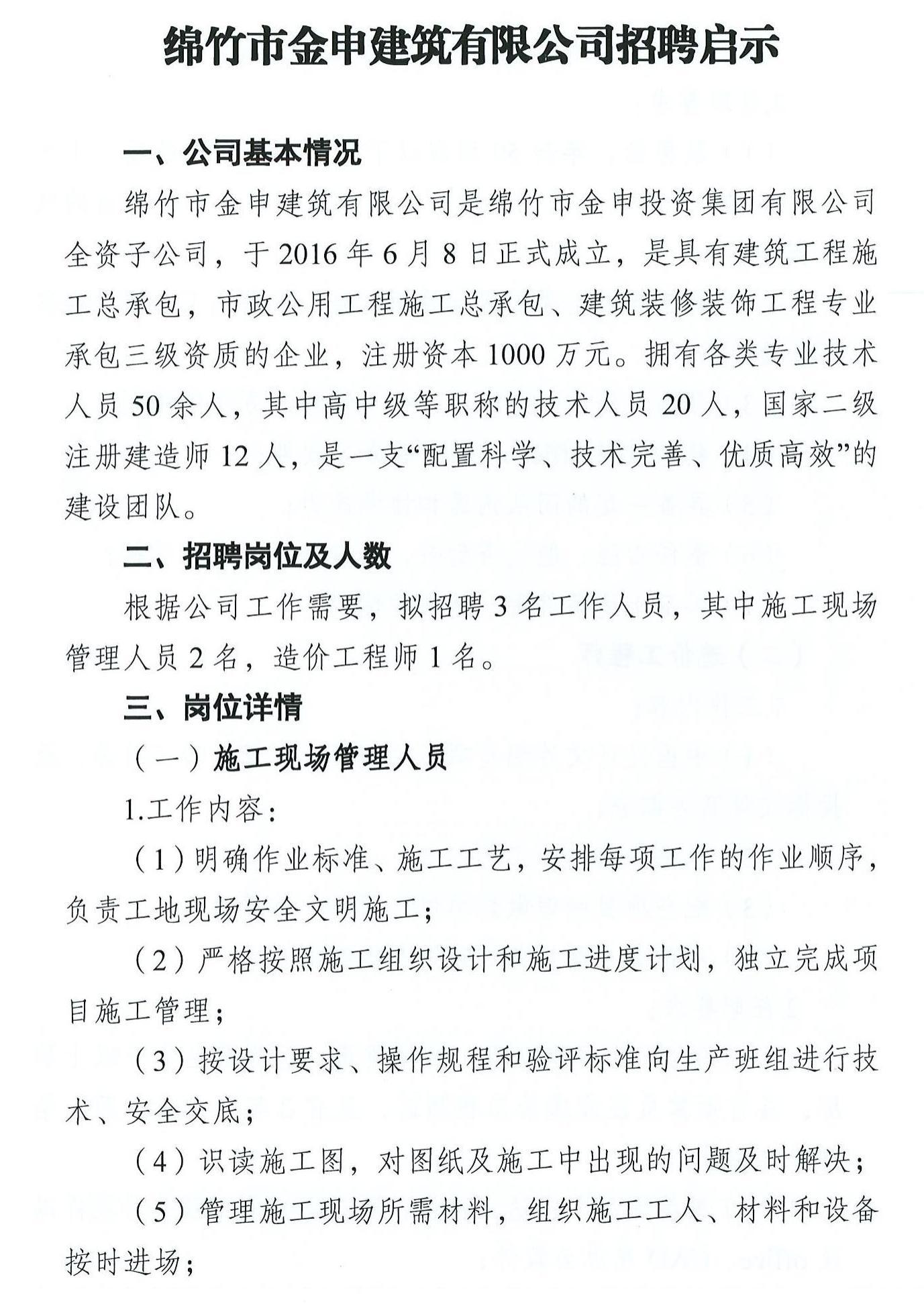 綿竹市金申建筑有限公司招聘啟事