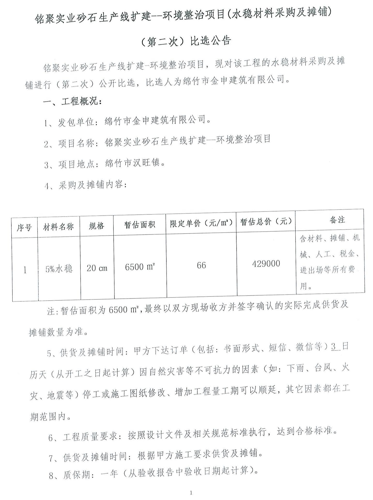 銘聚實(shí)業(yè)砂石生產(chǎn)線(xiàn)擴建環(huán)境整治項目(第二次)比選公告