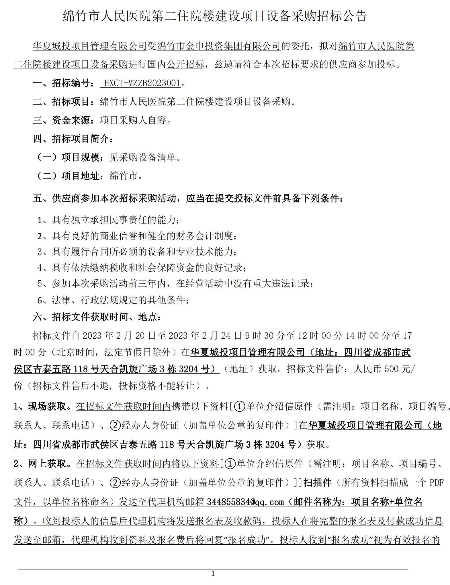 綿竹市人民醫院第二住院樓建設項目設備采購招標公告