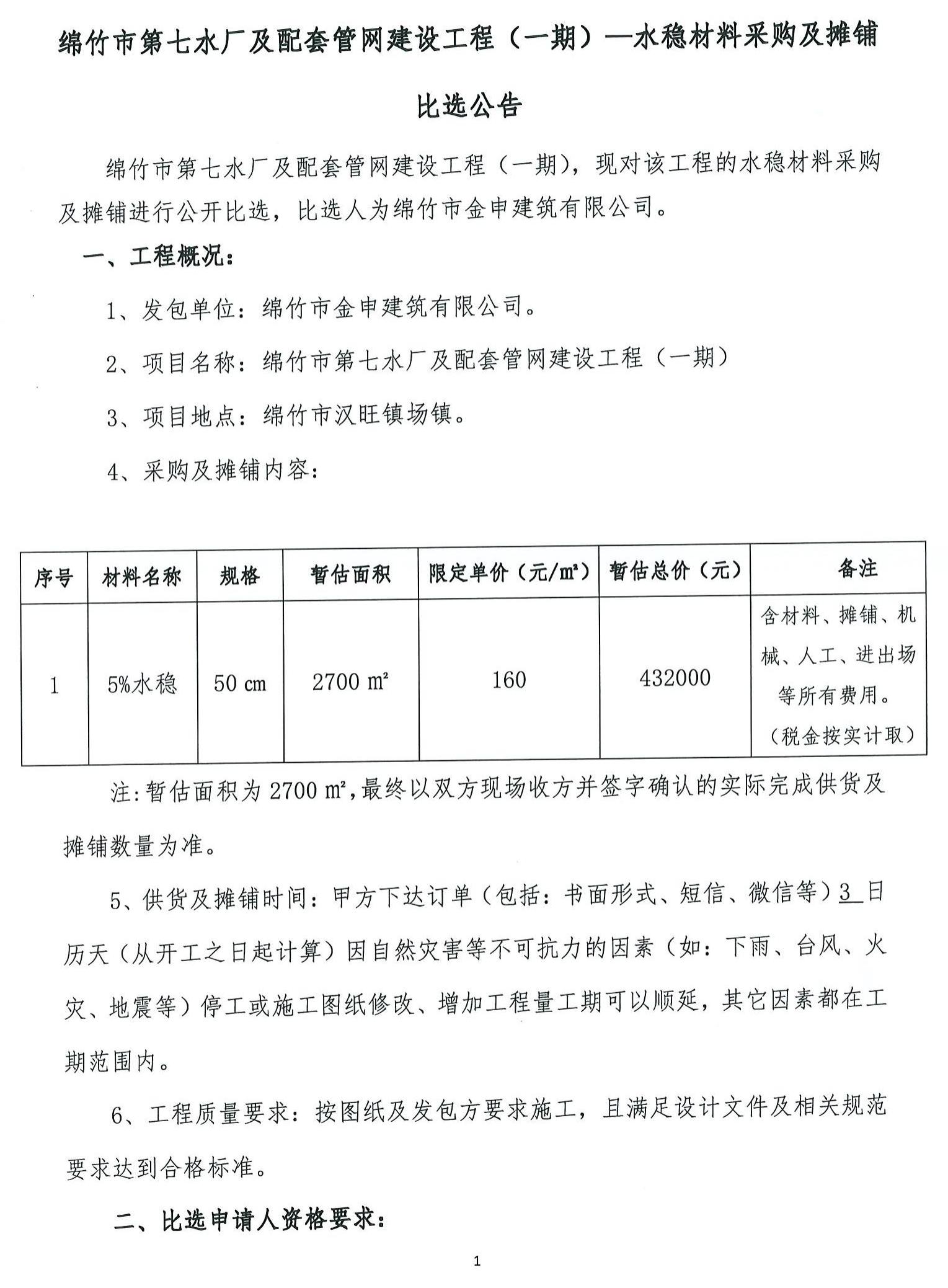 綿竹市第七水廠(chǎng)及配套管網(wǎng)建設項目水穩材料采購比選公告