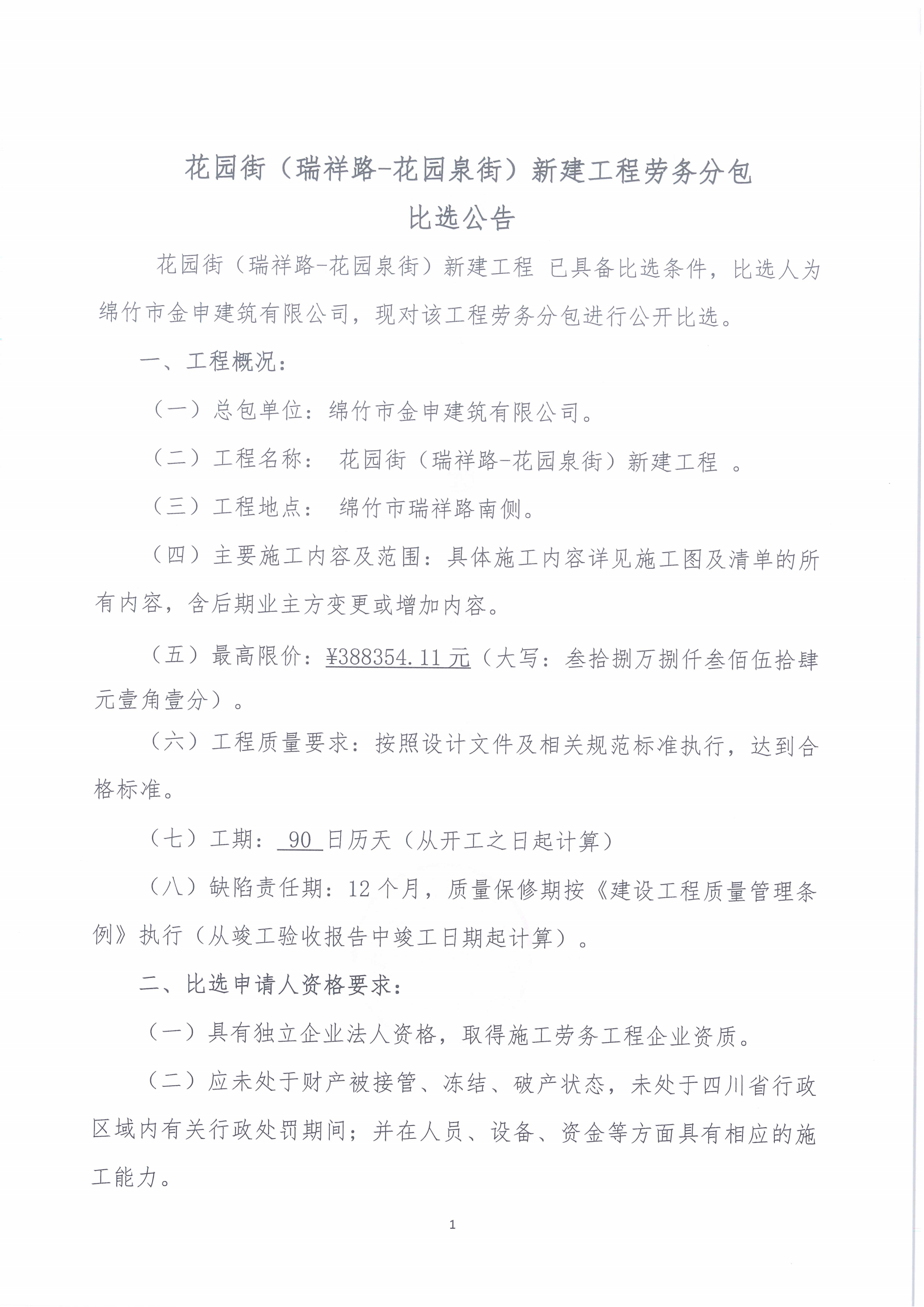 花園街(瑞祥路-花園泉街) 新建工程勞務(wù)分包比選公告
