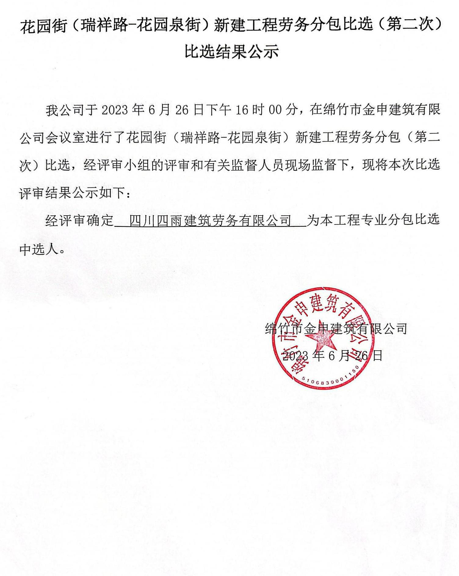 花園街(瑞祥路-花園泉街) 工程勞務(wù)分包第二次結果公示