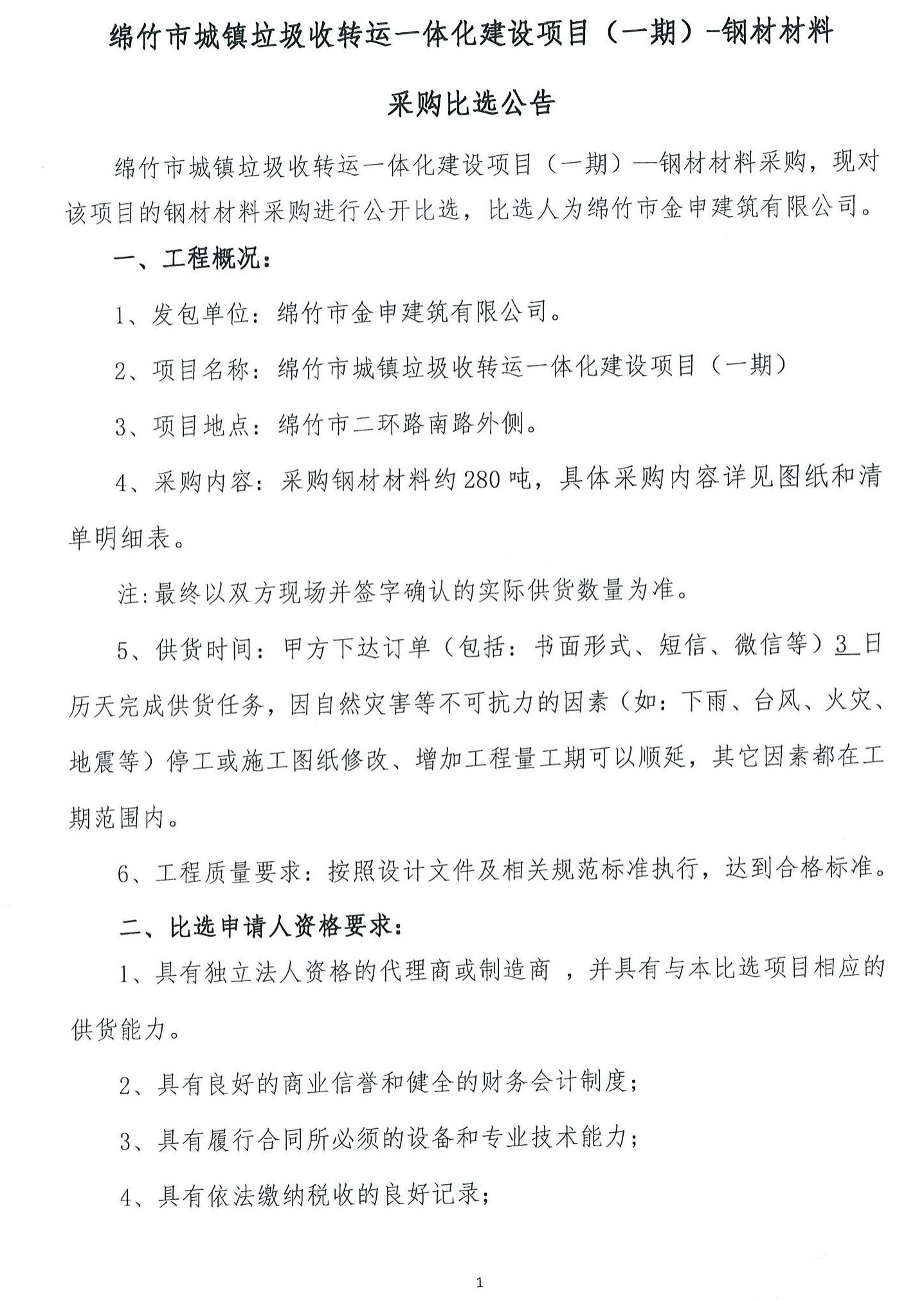 城鎮垃圾收轉運一體化建設項目(一期)鋼材采購比選公告