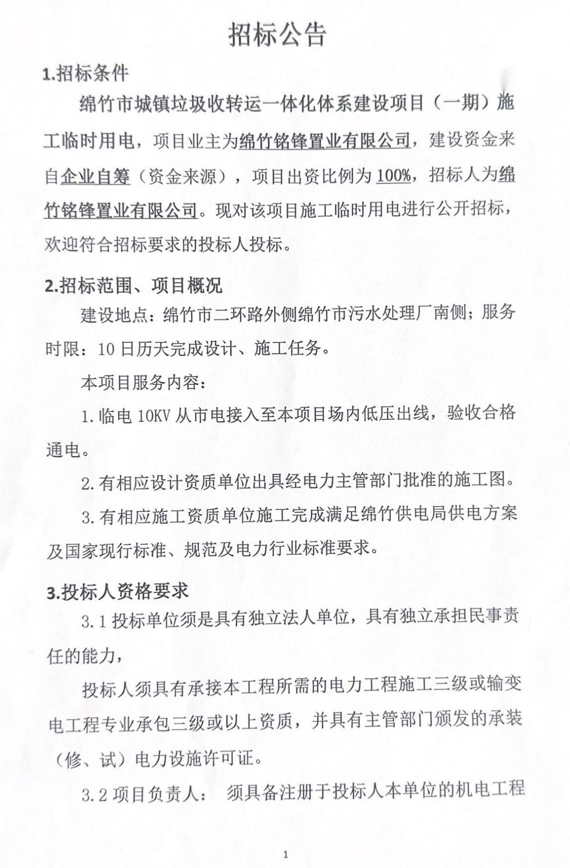 城鎮垃圾收轉運一體化建設項目(一期)臨時(shí)用電招標公告