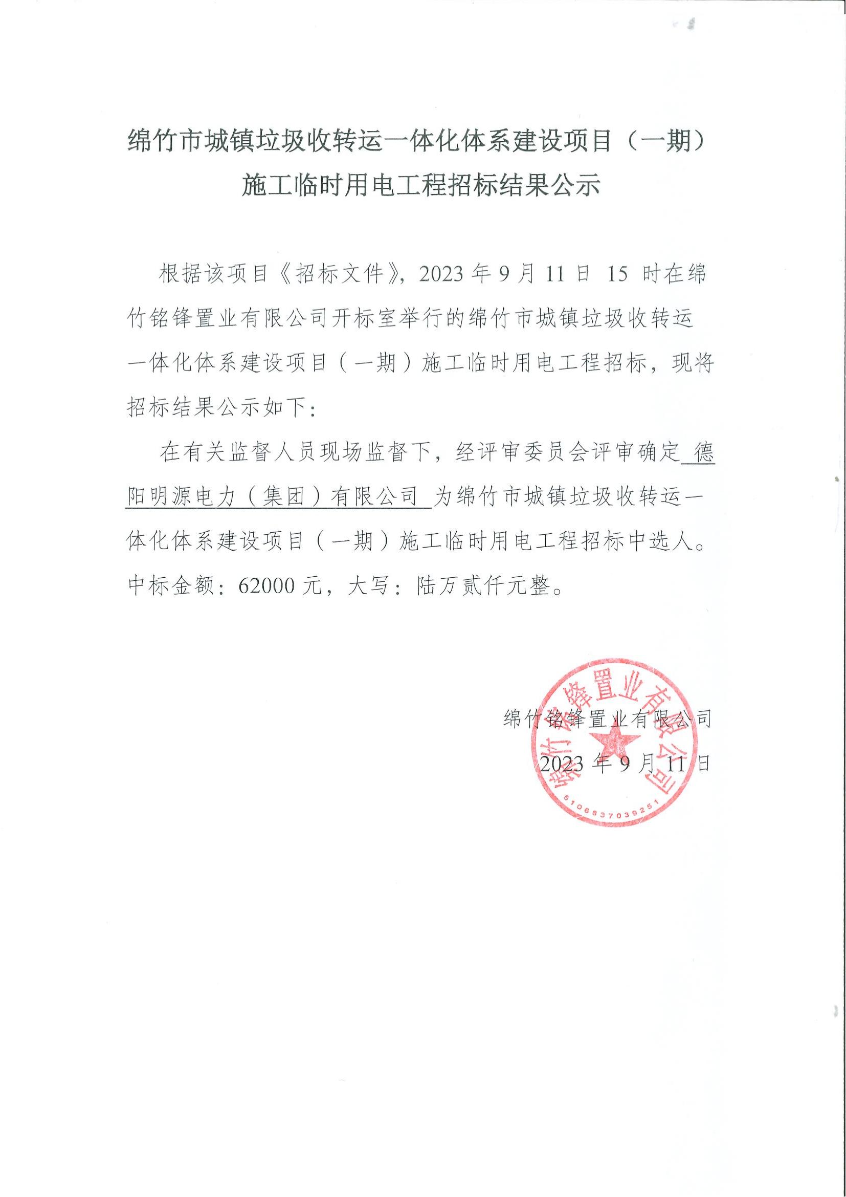 城鎮垃圾收轉運一體化建設項目(一期)臨時(shí)用電結果公告