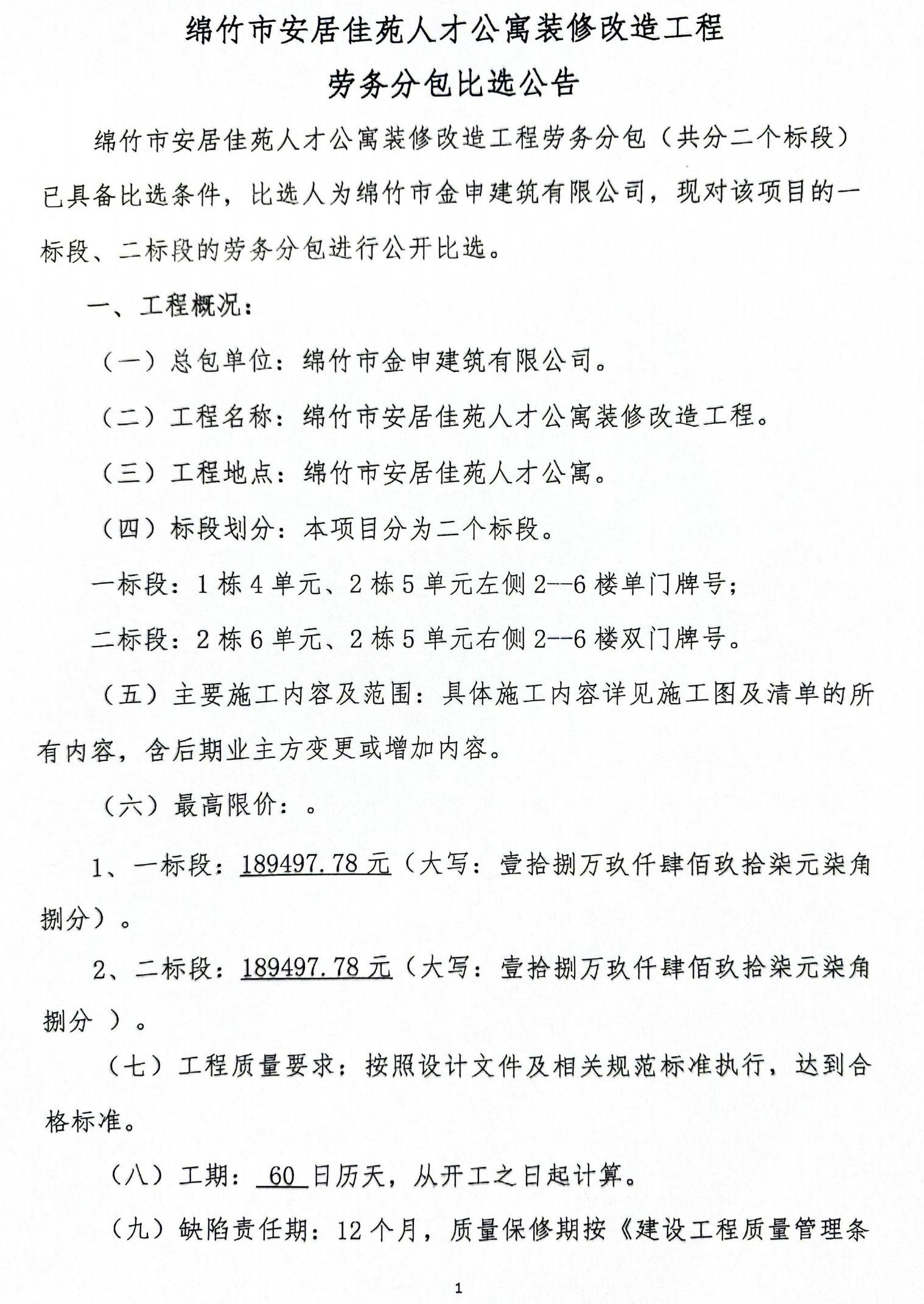 綿竹市人才公寓裝修改造工程勞務(wù)分包比選公告