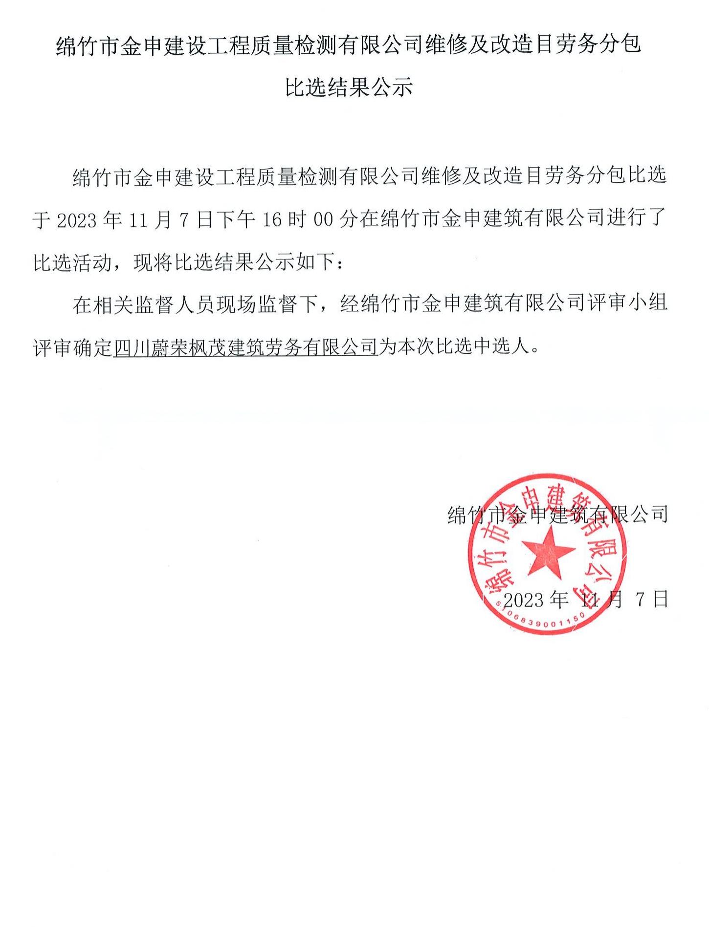 金申質(zhì)檢公司維修及改造項目勞務(wù)分包比選結果公示