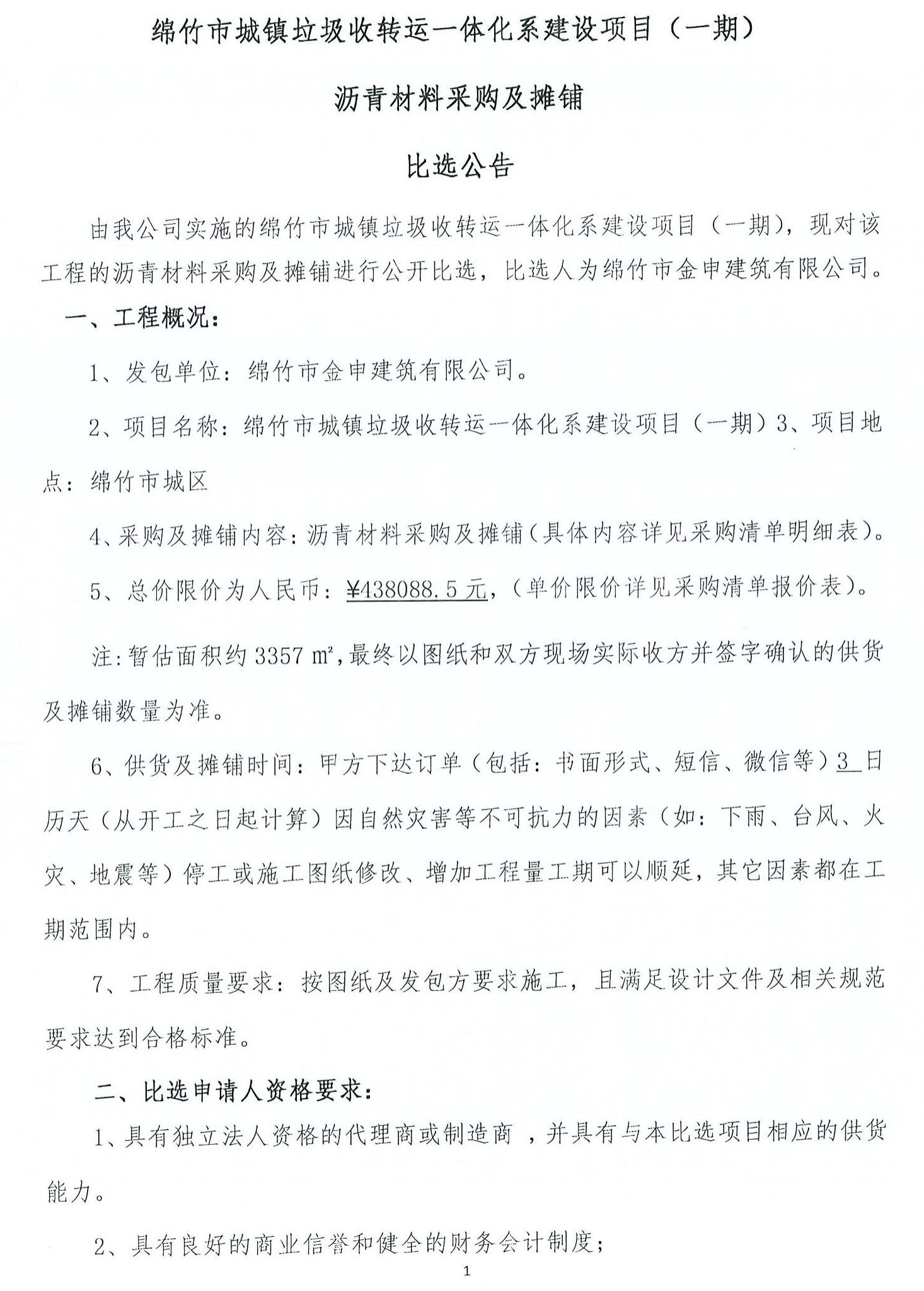 城鎮垃圾收轉運一體化建設(一期)瀝青材料采購比選公告