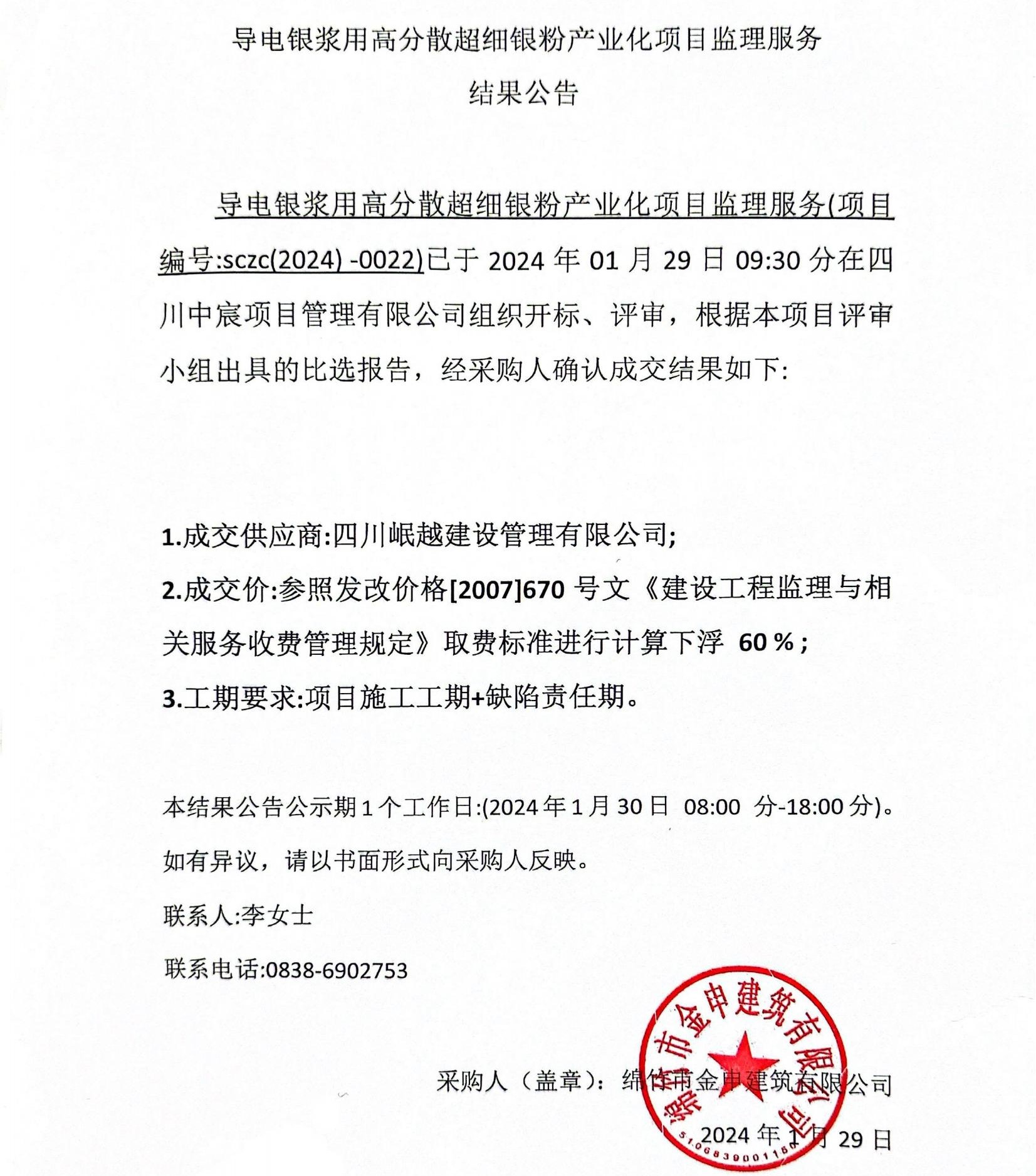導電銀漿用高分散超細銀粉產(chǎn)業(yè)化項目監理服務(wù)結果公示