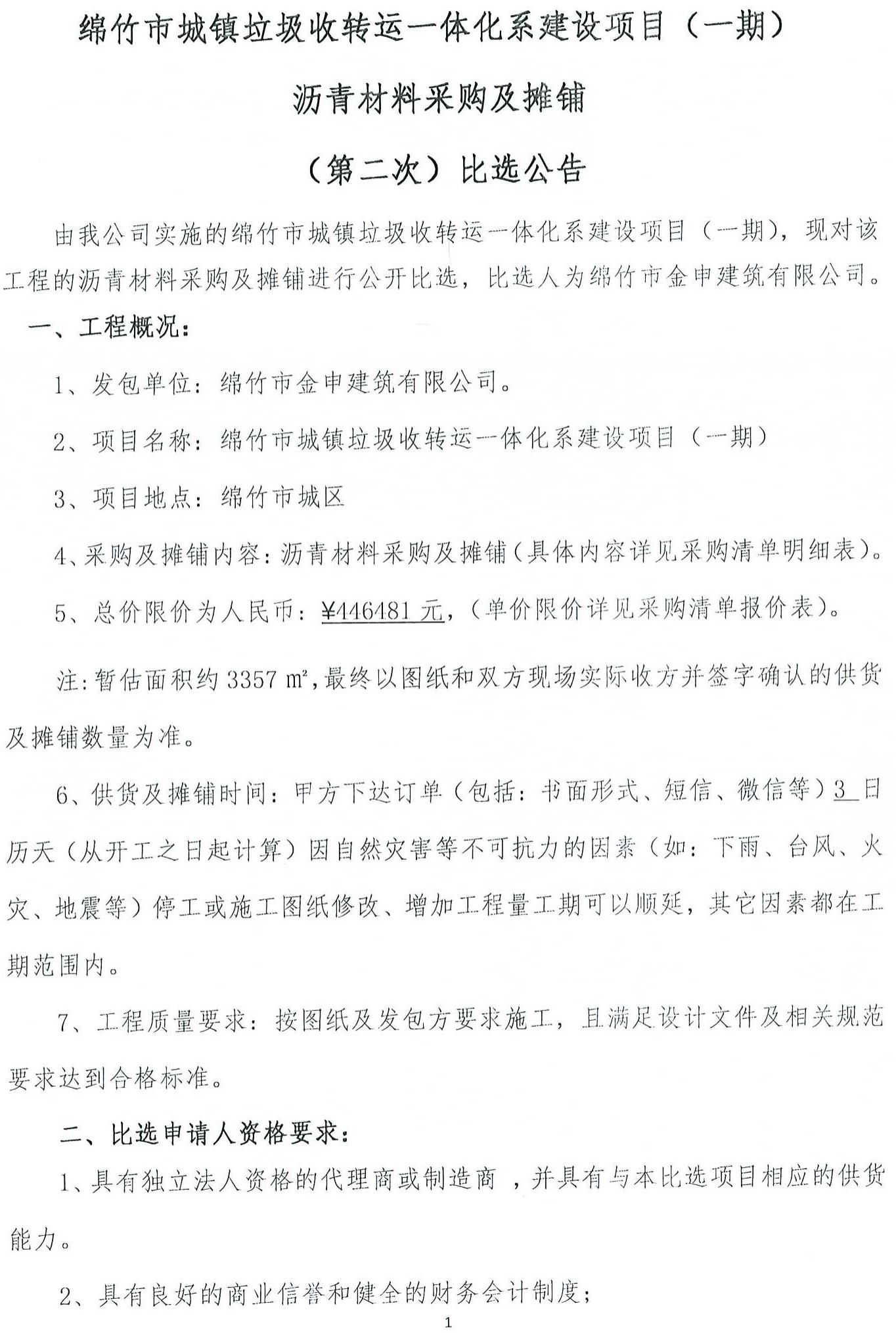 城鎮垃圾收轉運一體化(一期)瀝青材料第二次比選公告