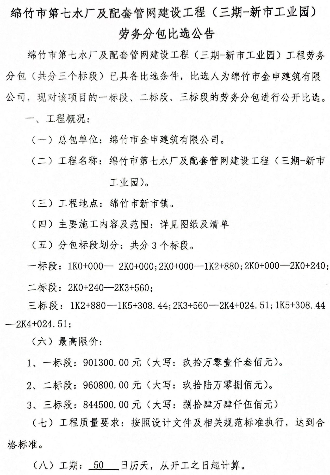 第七水廠(chǎng)及配套管網(wǎng)建設工程(三期)勞務(wù)分包比選公告
