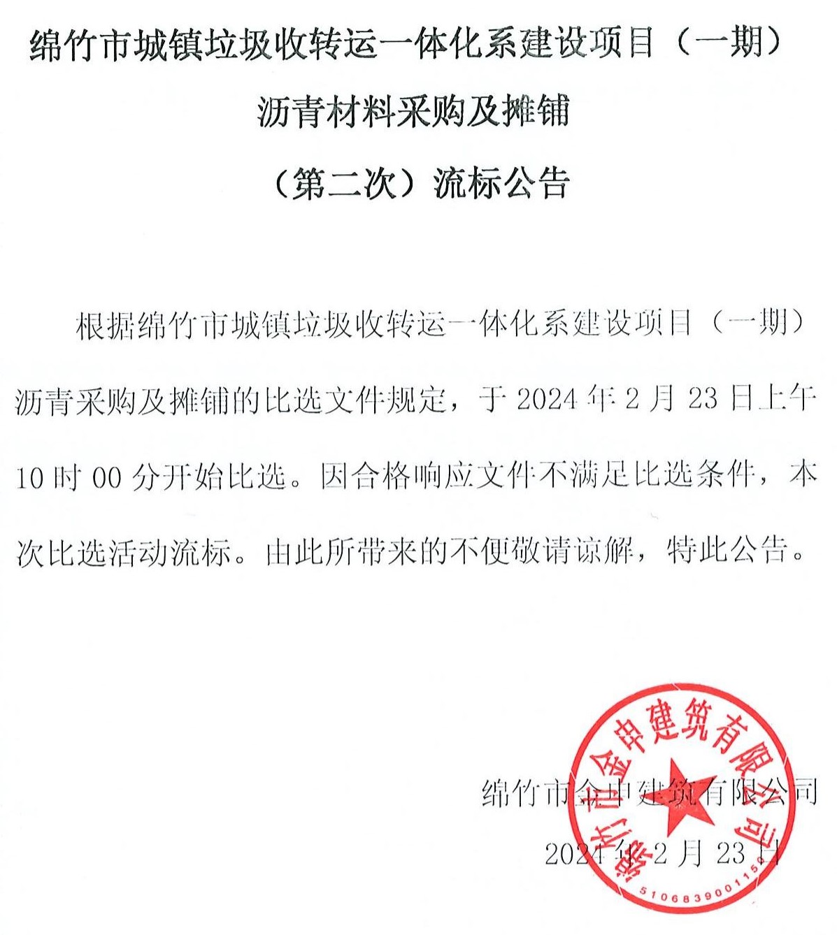 城鎮垃圾收轉運一體化(一期)瀝青材料第二次流標公告