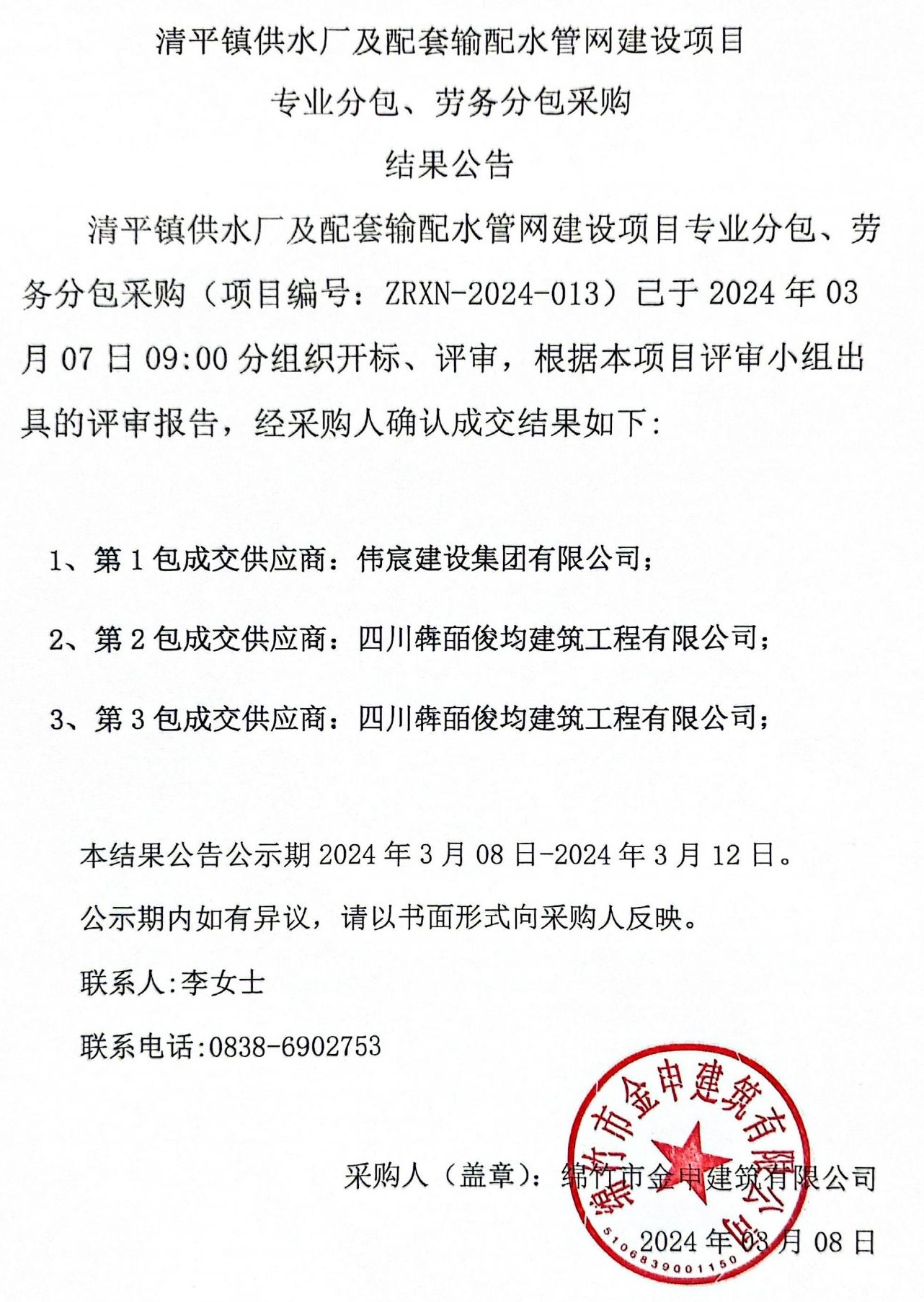 清平供水廠(chǎng)管網(wǎng)建設項目專(zhuān)業(yè)分包、勞務(wù)分包采購結果公示