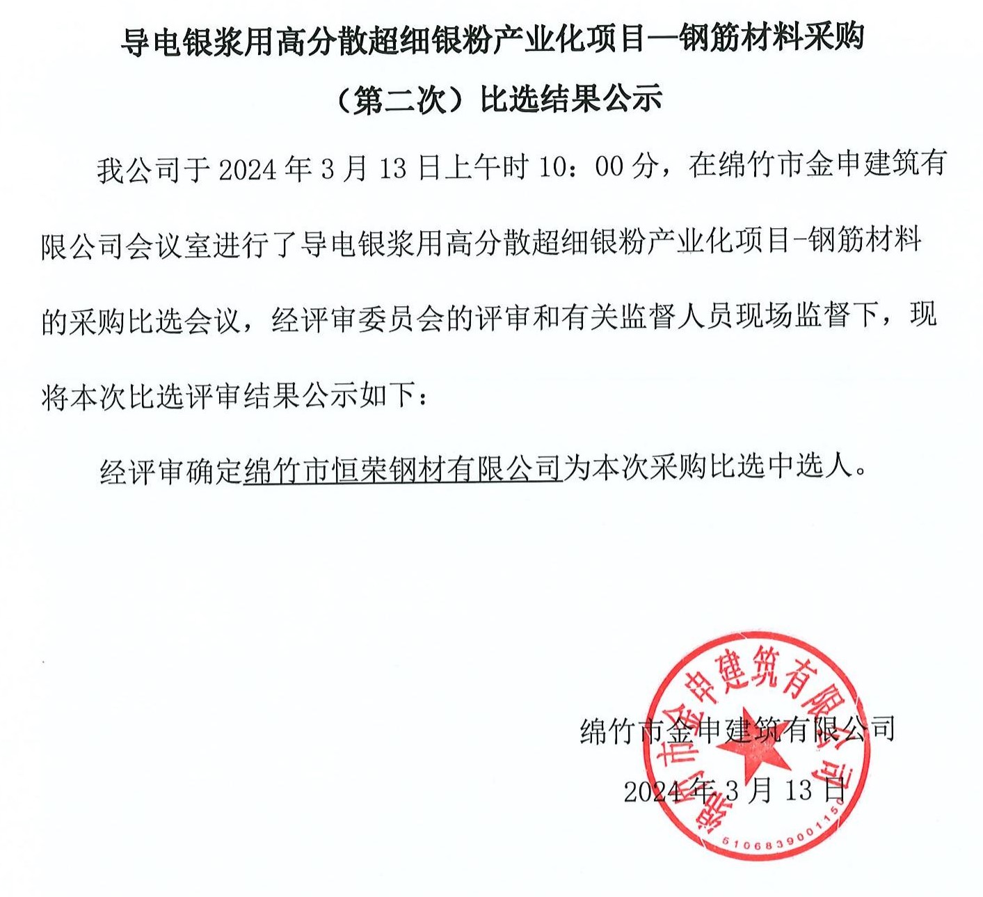 導電銀漿用高分散超細銀粉鋼筋(第二次)比選結果公示