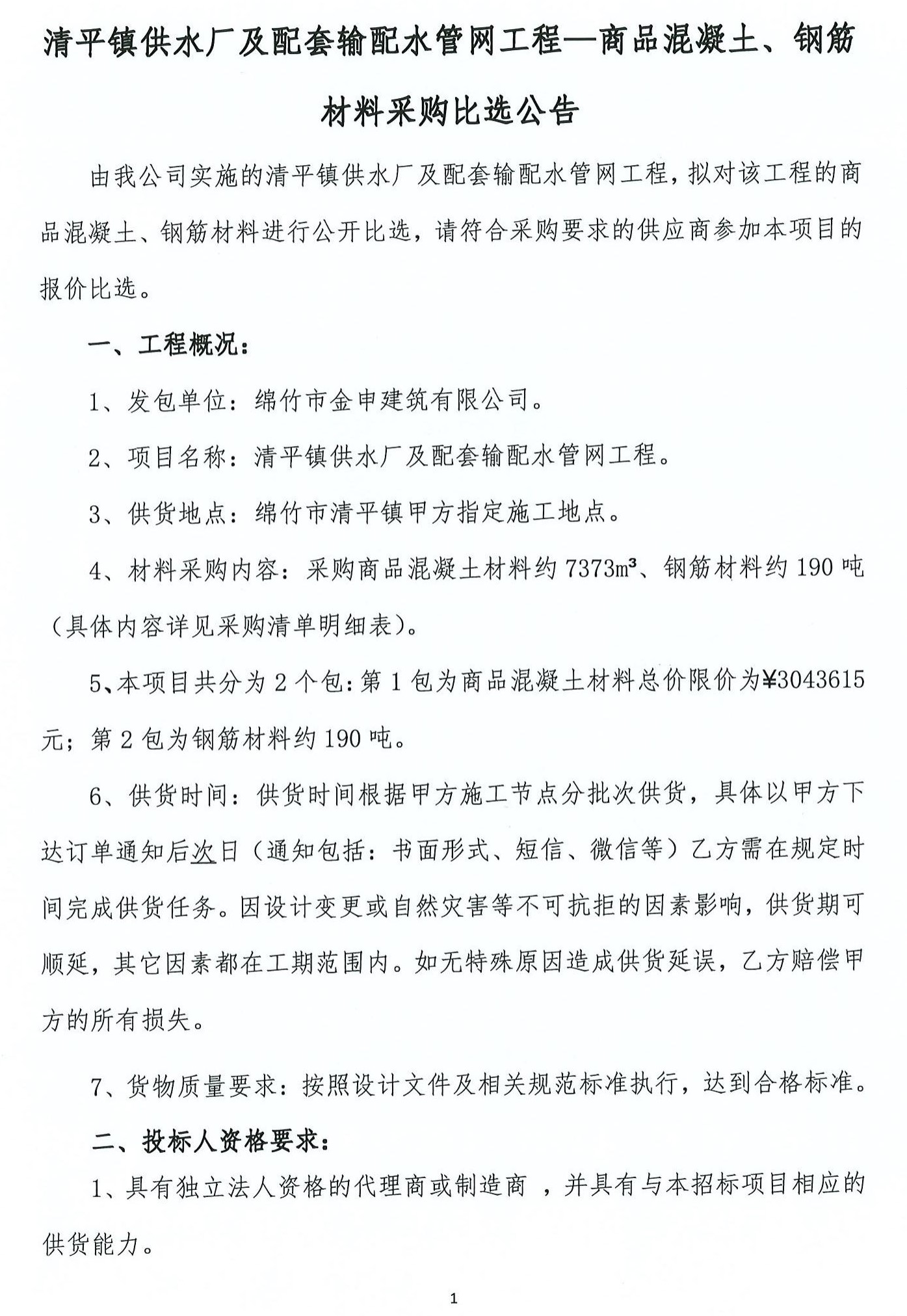 清平鎮供水廠(chǎng)及配套輸配水管網(wǎng)商品混凝土、鋼筋比選公告