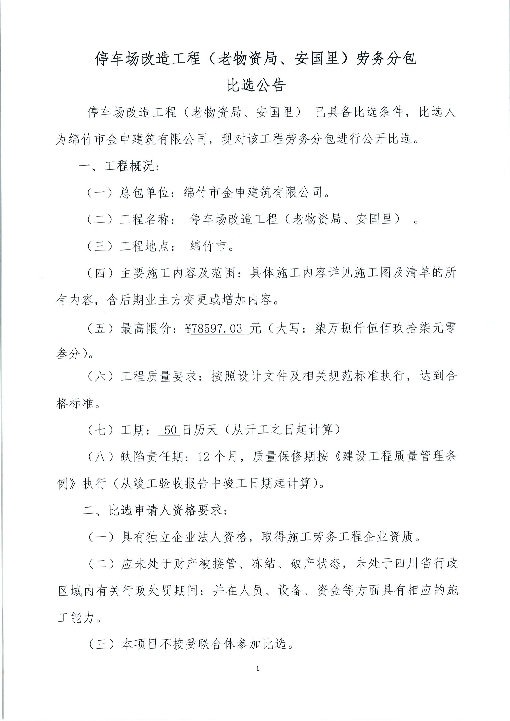 停車(chē)場(chǎng)改造工程(老物資局、安國里)勞務(wù)分包比選公告