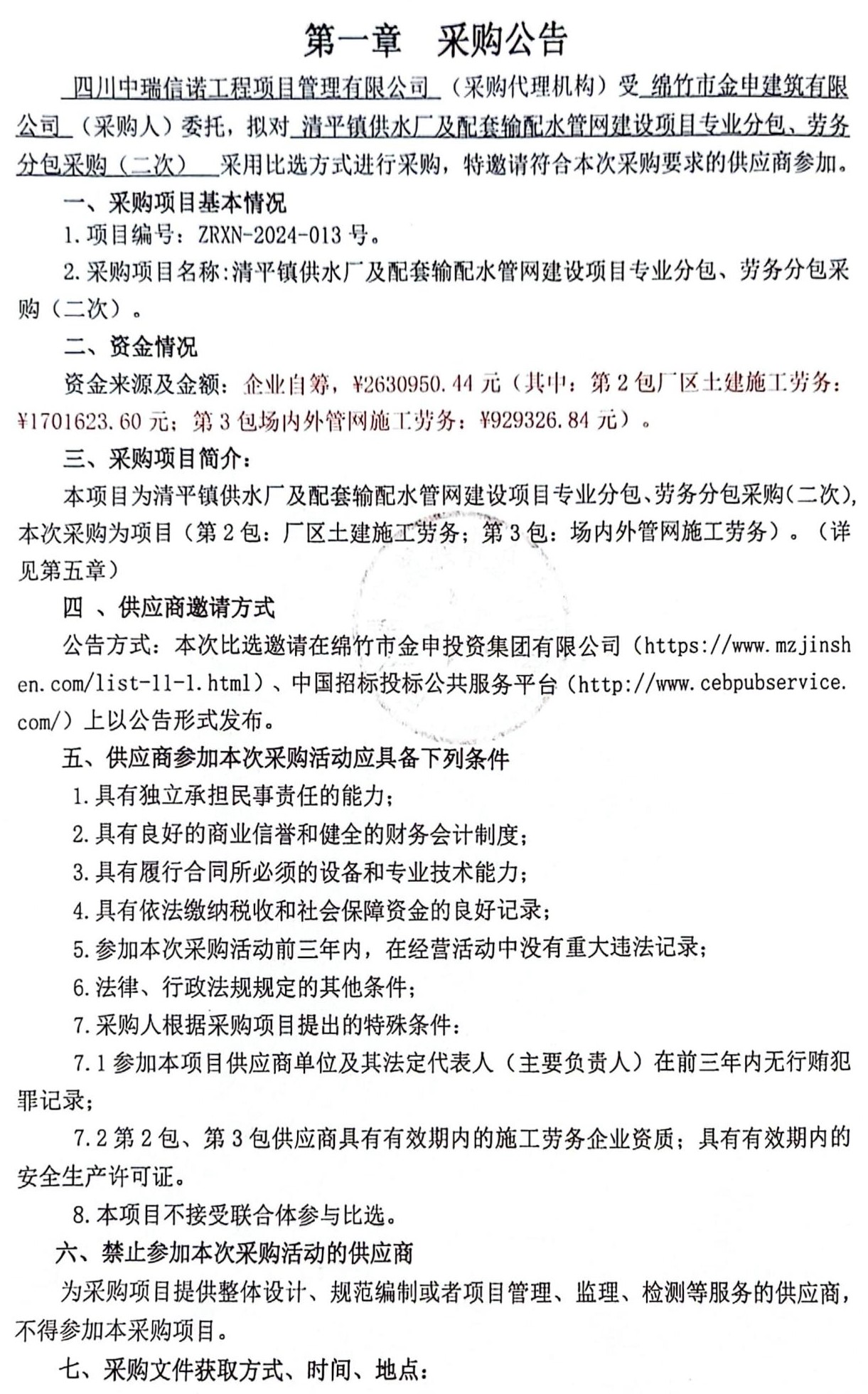清平供水廠(chǎng)管網(wǎng)建設項目專(zhuān)業(yè)、勞務(wù)分包(二次)采購公告