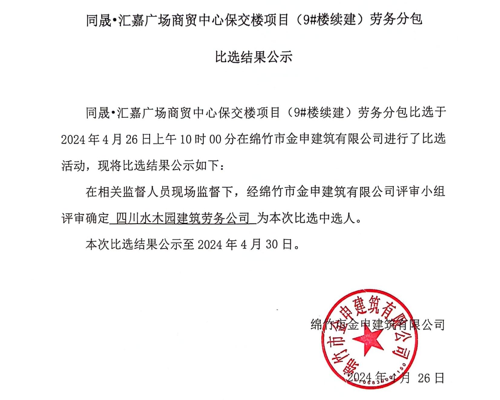 同晟·匯嘉廣場(chǎng)商貿中心保交樓(9#樓續建)比選結果公示