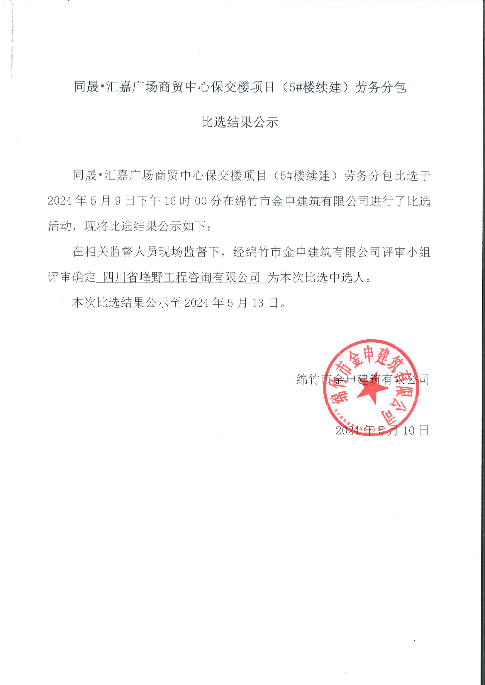 同晟·匯嘉廣場(chǎng)商貿中心保交樓項目(5#樓續建)比選結果公示