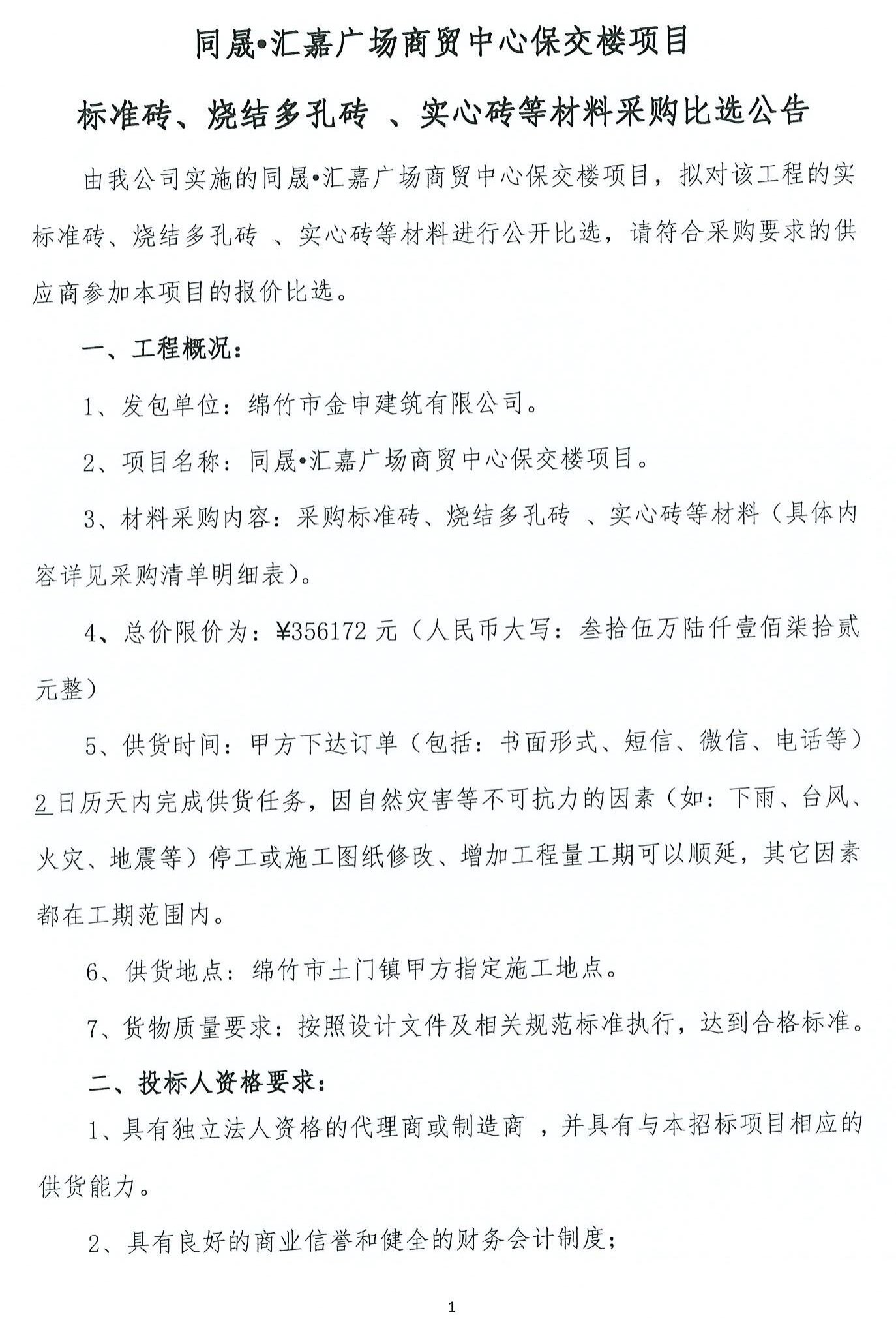 同晟·匯嘉廣場(chǎng)項目標準磚、多孔磚、實(shí)心磚采購比選公告