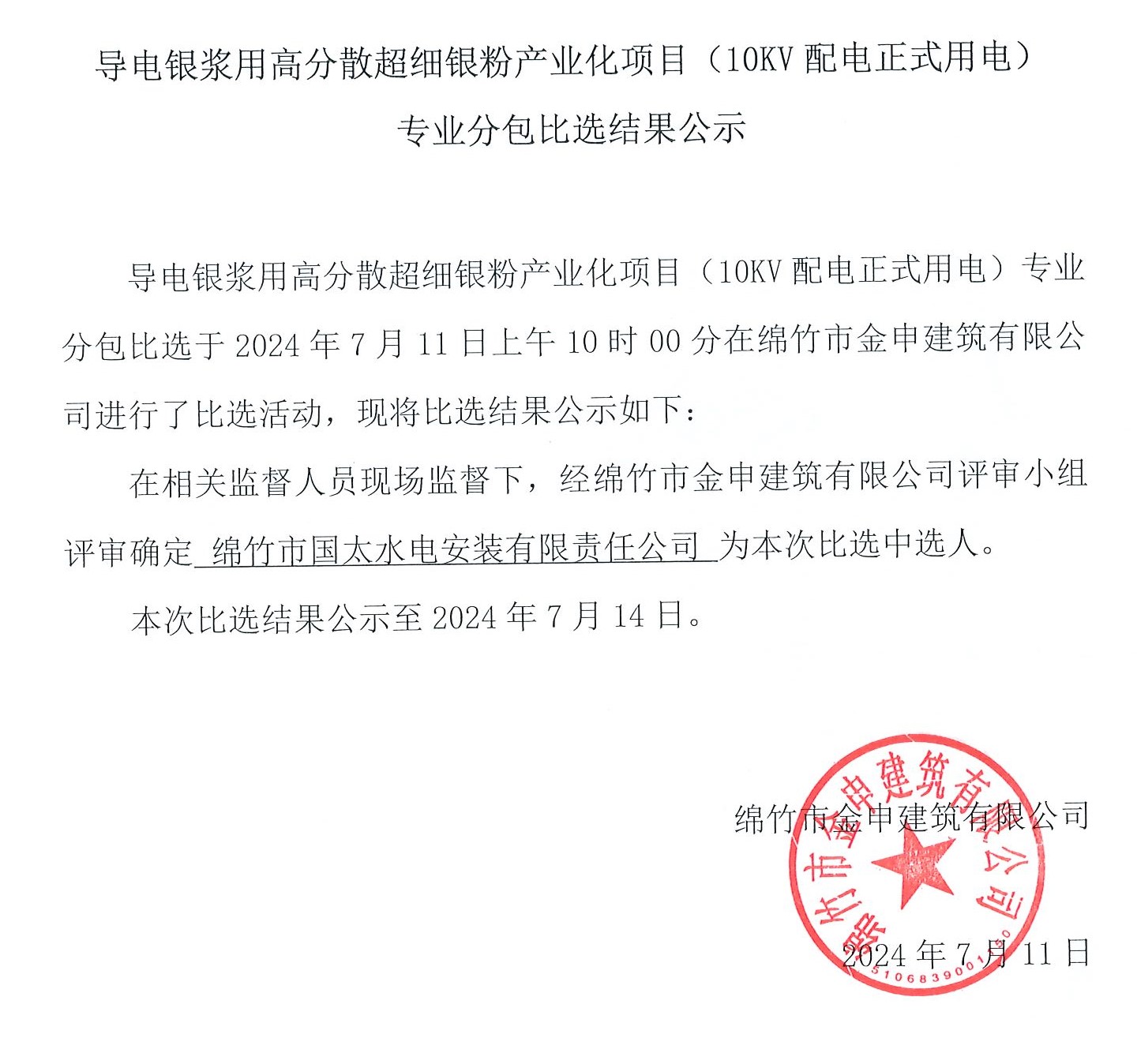 導電銀漿用高分散超細銀粉產(chǎn)業(yè)化項目專(zhuān)業(yè)分包結果公示