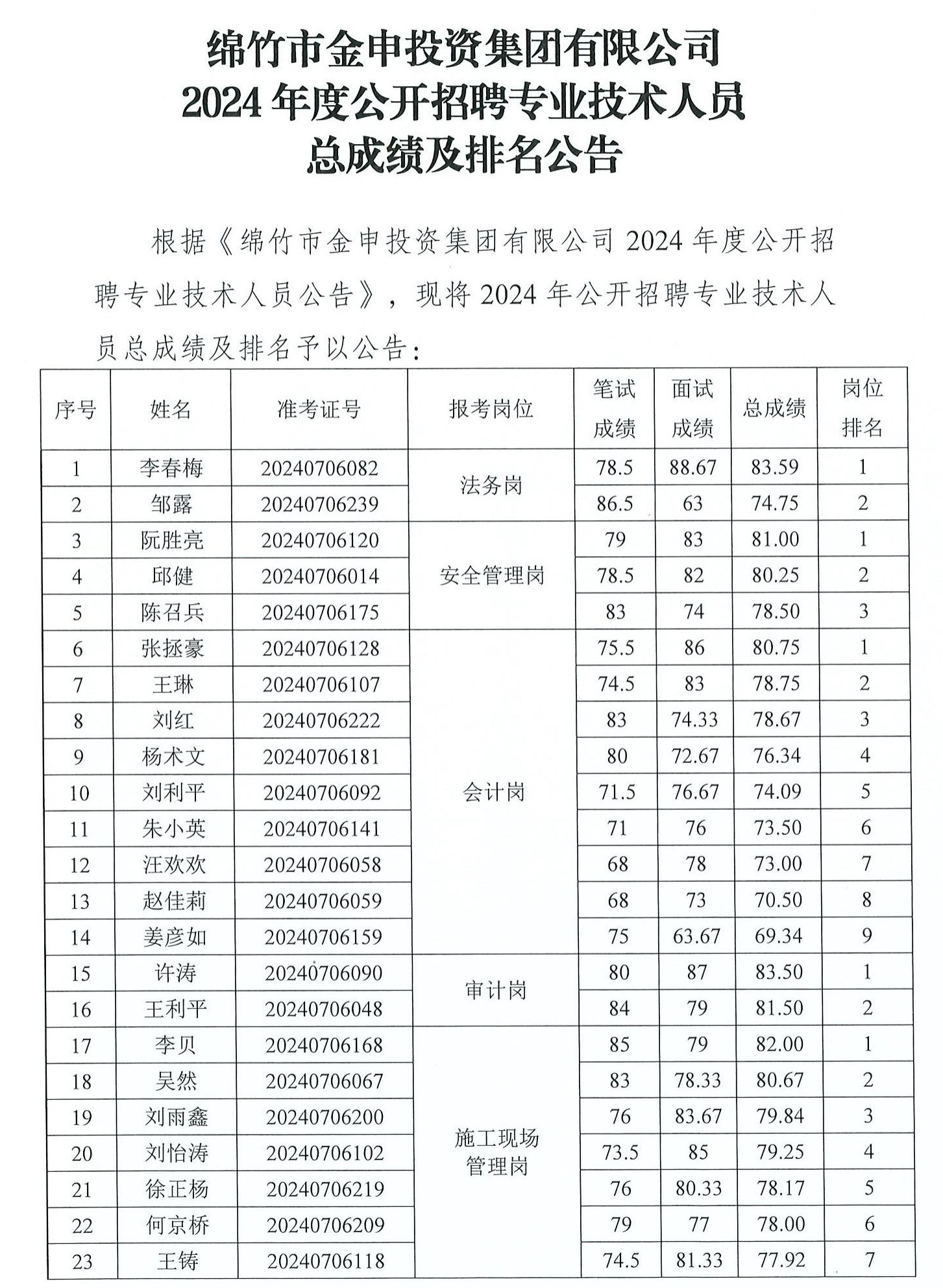 金申集團2024年度公開(kāi)招聘專(zhuān)業(yè)技術(shù)人員總成績(jì)及排名公告