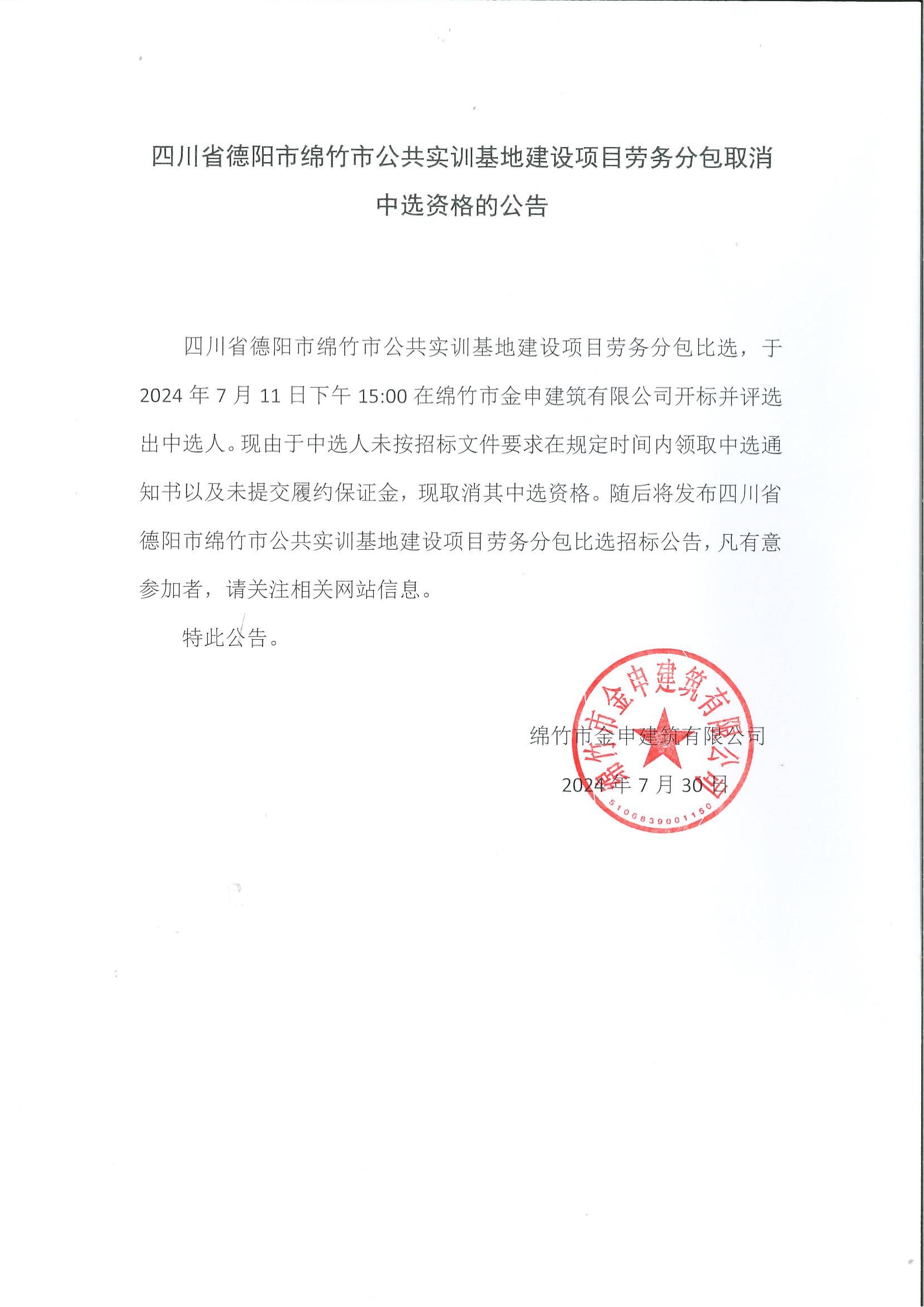 綿竹市公共實(shí)訓基地建設項目勞務(wù)分包取消中選資格的公告