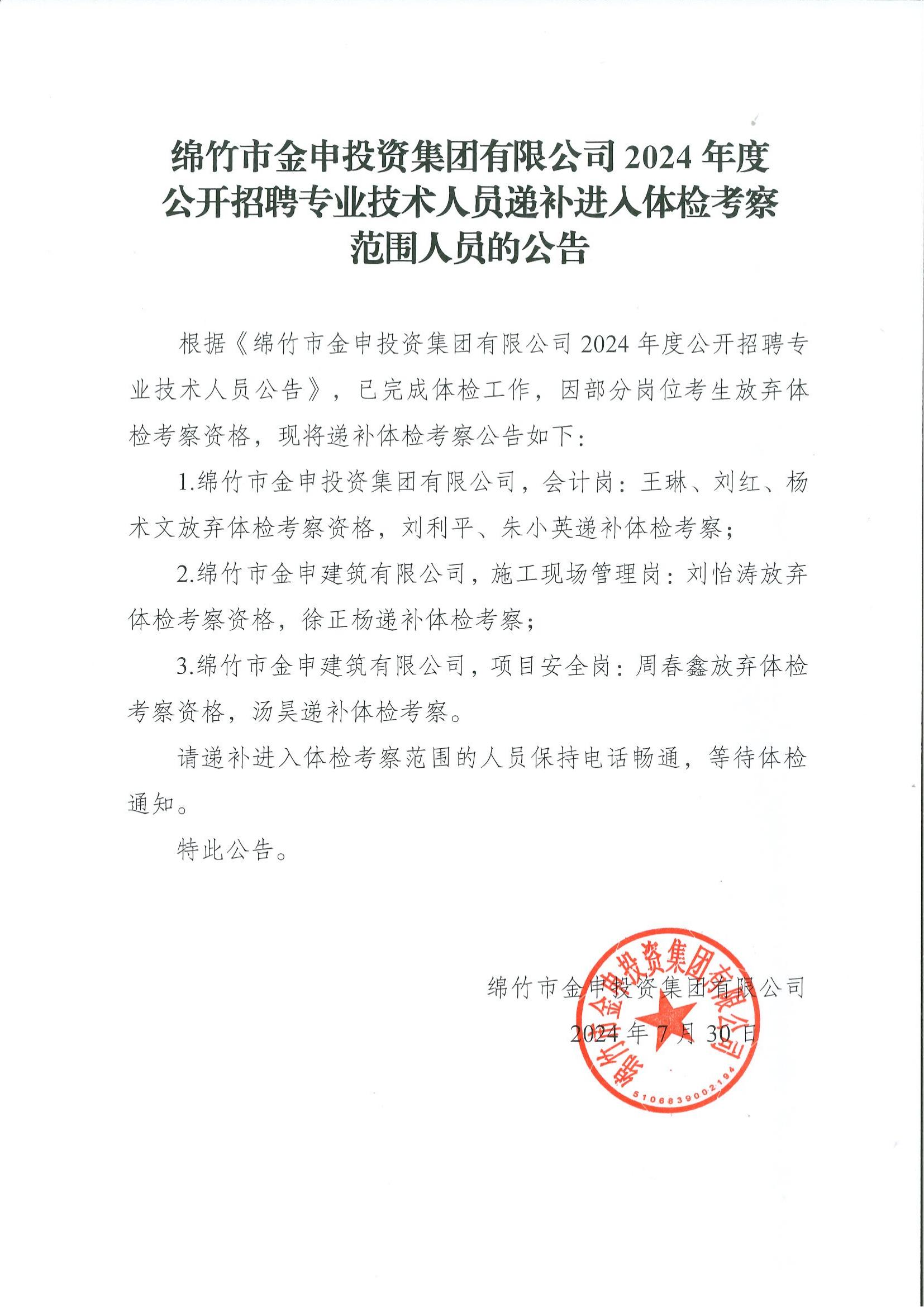 公開(kāi)招聘專(zhuān)業(yè)技術(shù)人員遞補進(jìn)入體檢考察范圍人員的公告