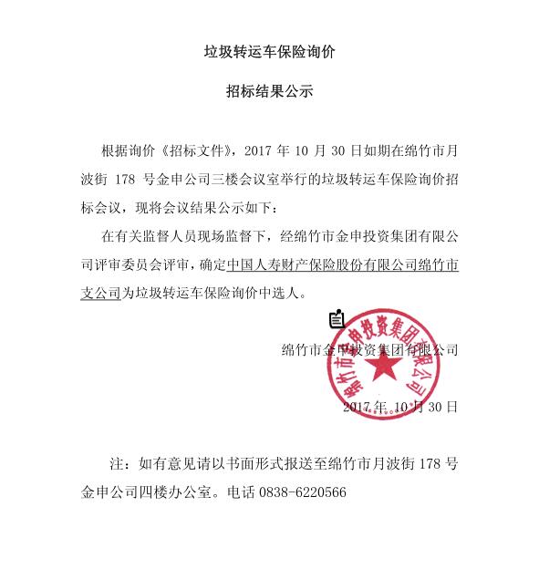 垃圾轉運車(chē)保險詢(xún)價(jià)結果公示