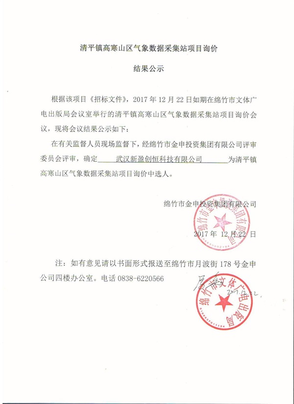 清平鎮高寒山區氣象數據采集站項目詢(xún)價(jià)結果公示