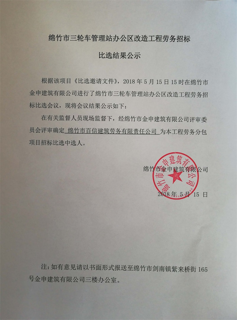 綿竹市三輪車(chē)管理站辦公區改造工程勞務(wù)招標比選結果公示