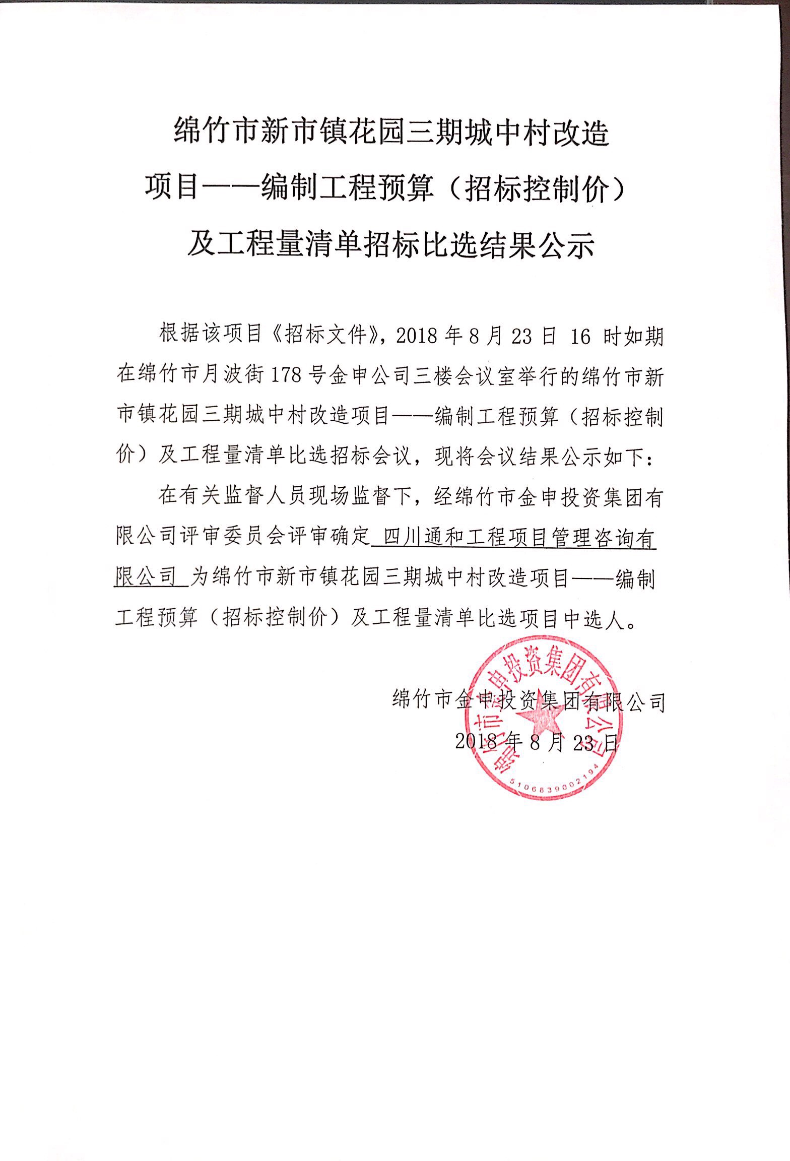 新市花園三期項目編制工程預算及工程量清單比選結果公示