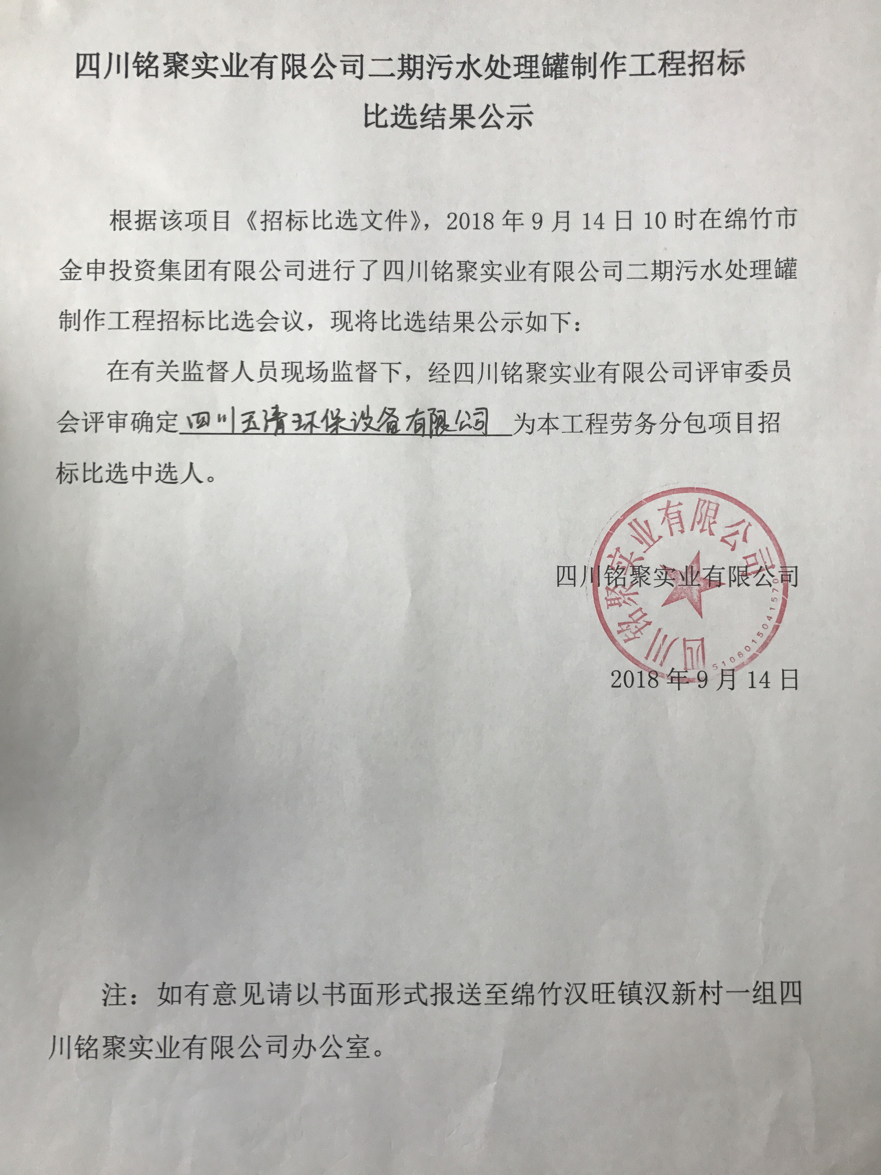 銘聚公司二期污水處理罐制作工程招標比選結果公示