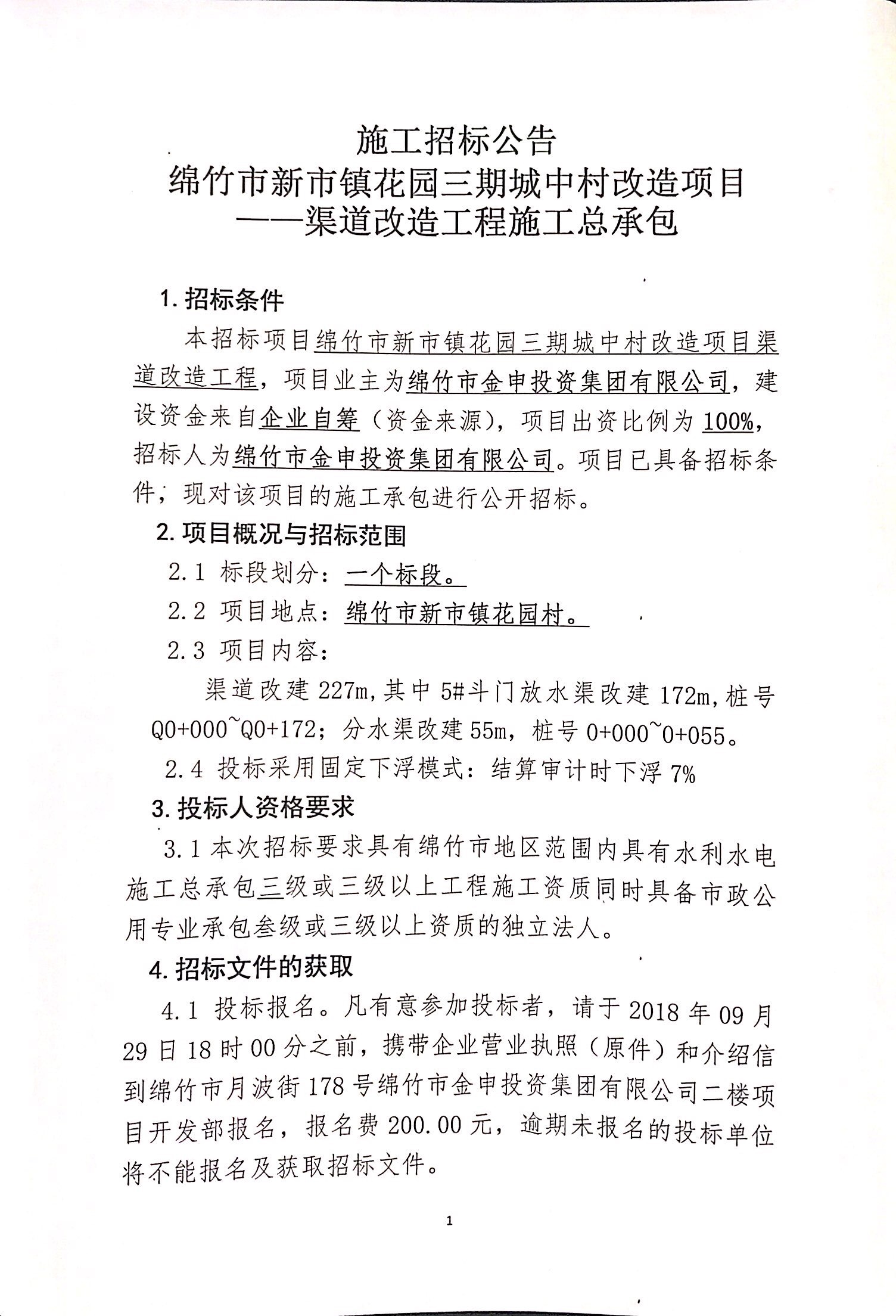 施工招標公告(新市花園三期渠道改造工程施工總承包)