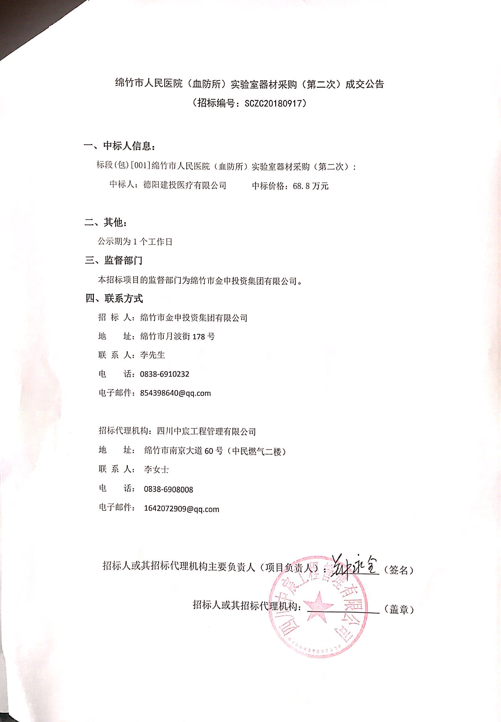 血防所實(shí)驗器材采購(第二次)成交公告