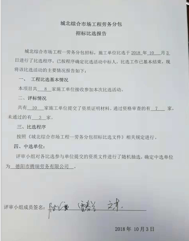 城北綜合市場(chǎng)工程勞務(wù)分包招標比選報告