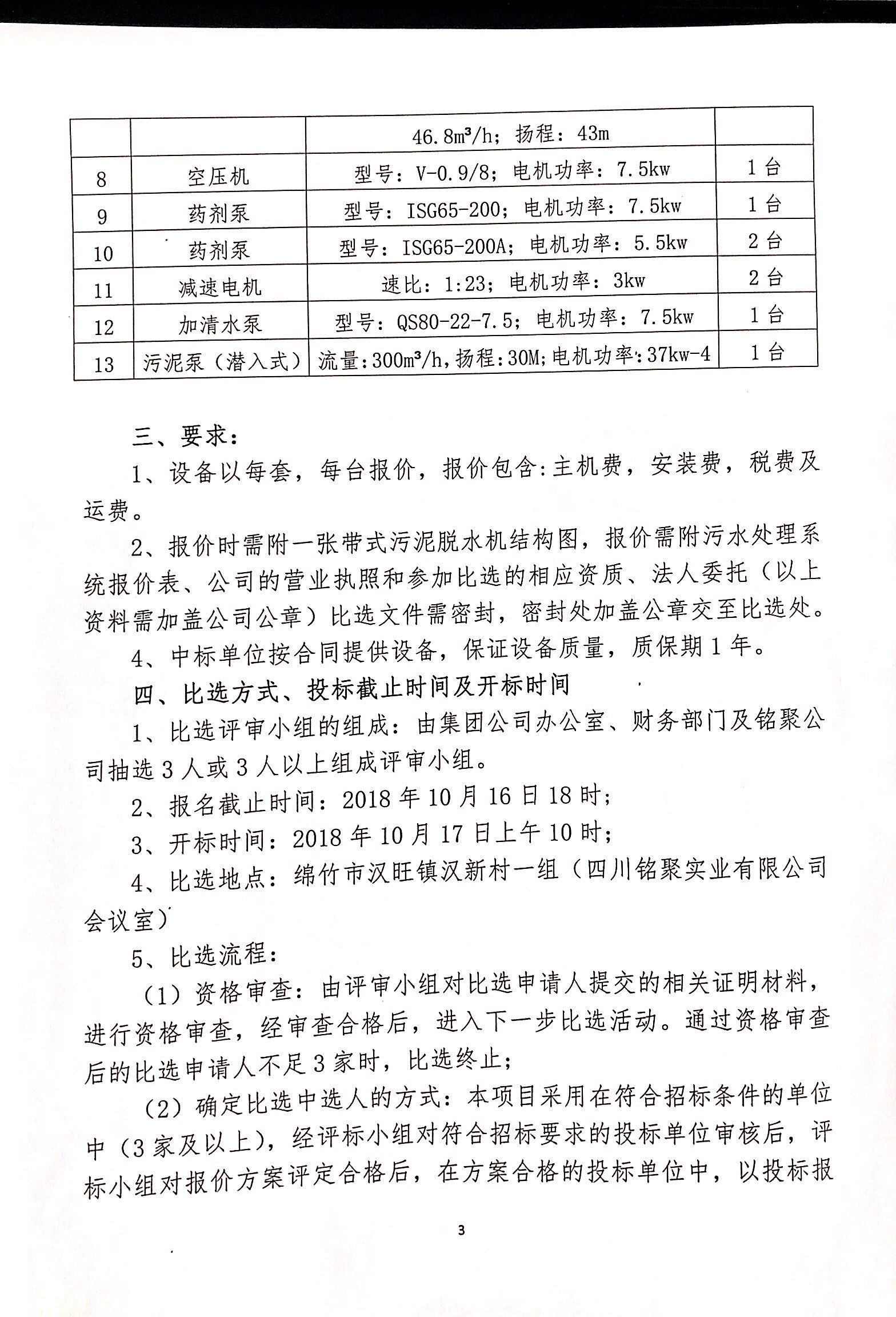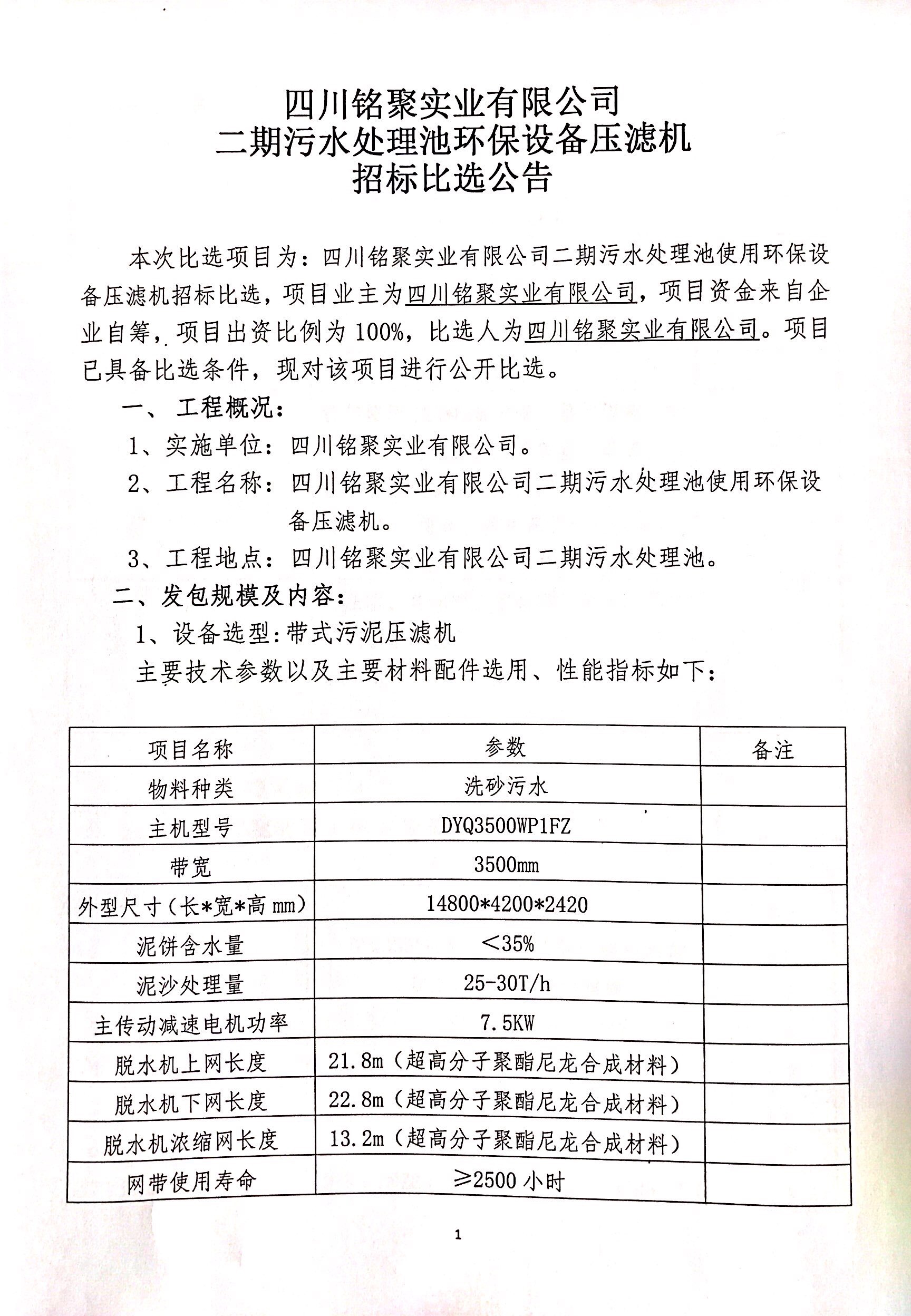 銘聚公司二期污水處理池環(huán)保設備壓濾機招標比選公告