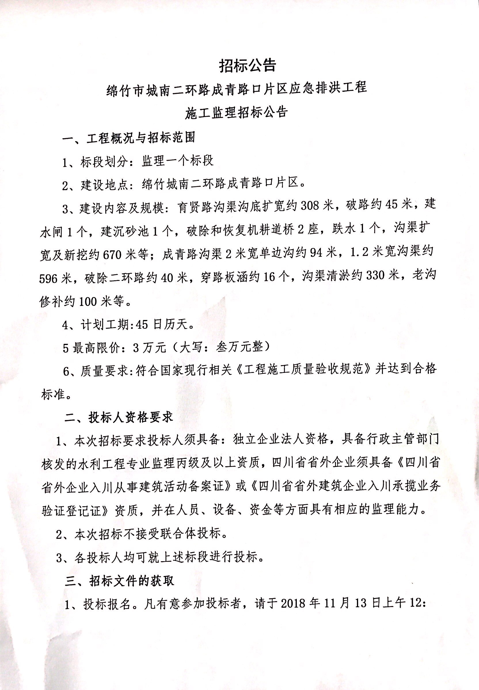 市城南二環(huán)路成青路口片區應急排洪工程施工監理招標公告