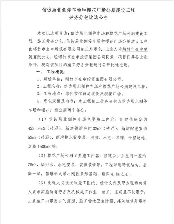 信訪(fǎng)局北側停車(chē)場(chǎng)和櫻花廣場(chǎng)公廁工程勞務(wù)分包比選公告