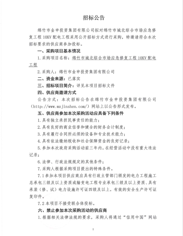 市城北綜合市場(chǎng)應急修復工程10KV配電招標公告