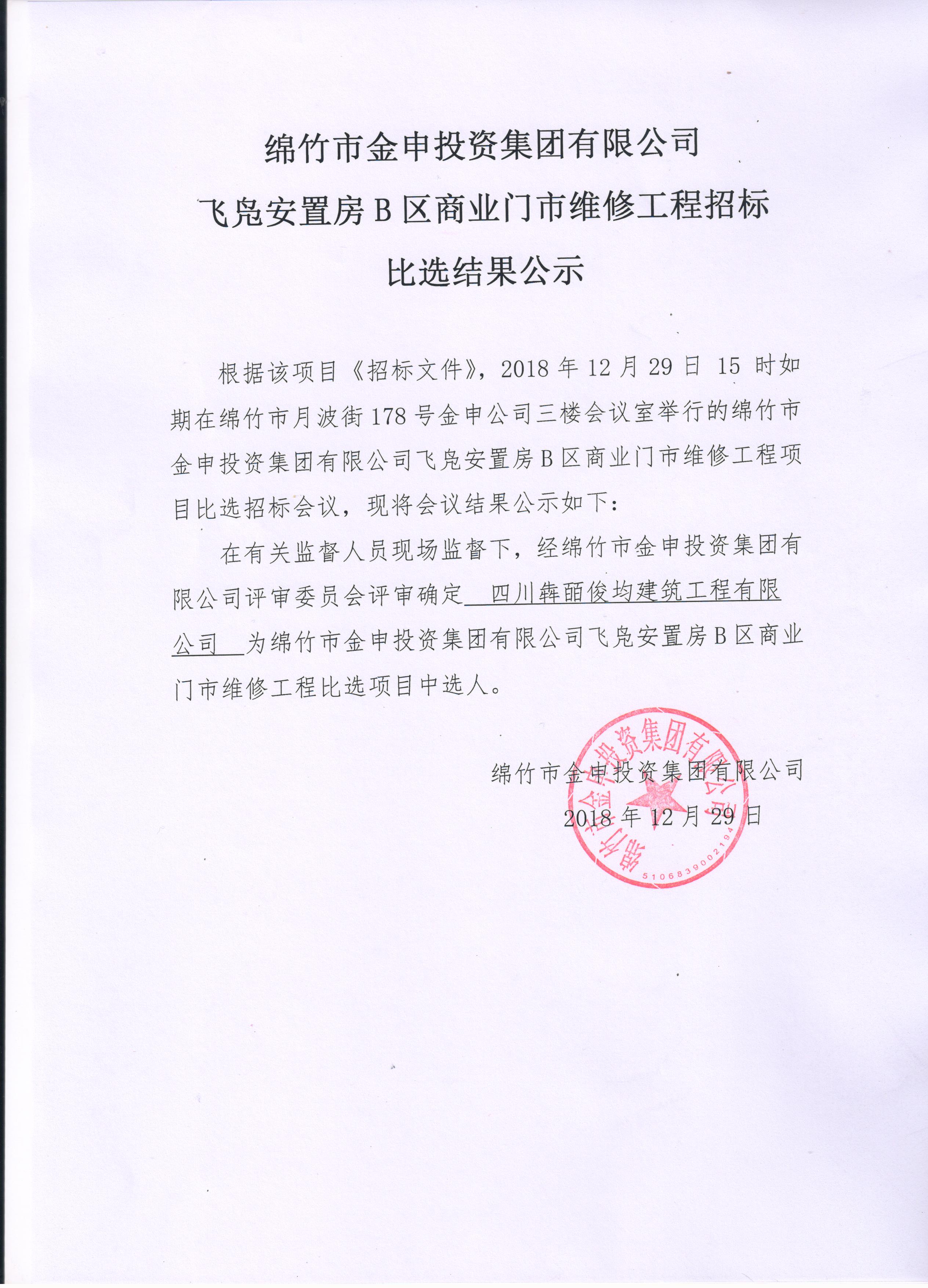 飛鳧安置房B區商業(yè)門(mén)市維修工程比選結果公示