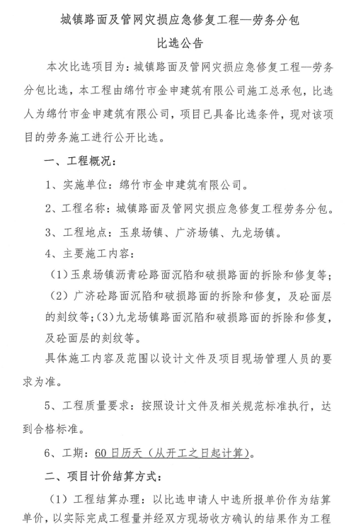 關(guān)于城鎮路面及管網(wǎng)災損應急修復工程勞務(wù)分包比選公告