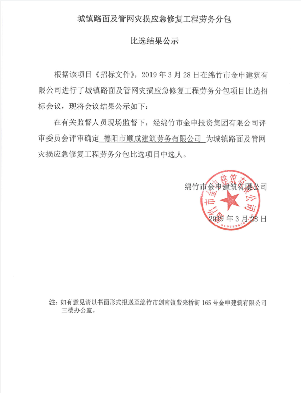 城鎮路面及管網(wǎng)災損應急修復工程勞務(wù)分包比選結果公示