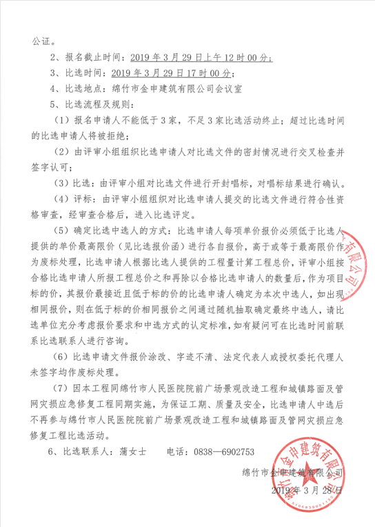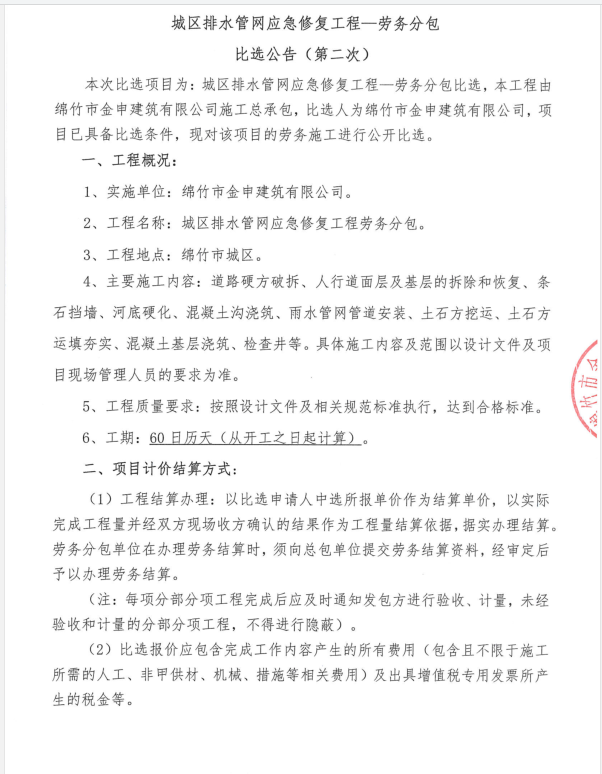 城區排水管網(wǎng)應急修復工程勞務(wù)分包比選公告(第二次)