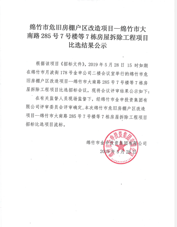 市大南路285號7號樓等7棟房屋拆除工程項目施工比選結果公示