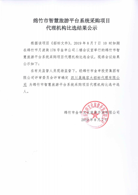 智慧旅游平臺系統采購項目代理機構比選結果公示