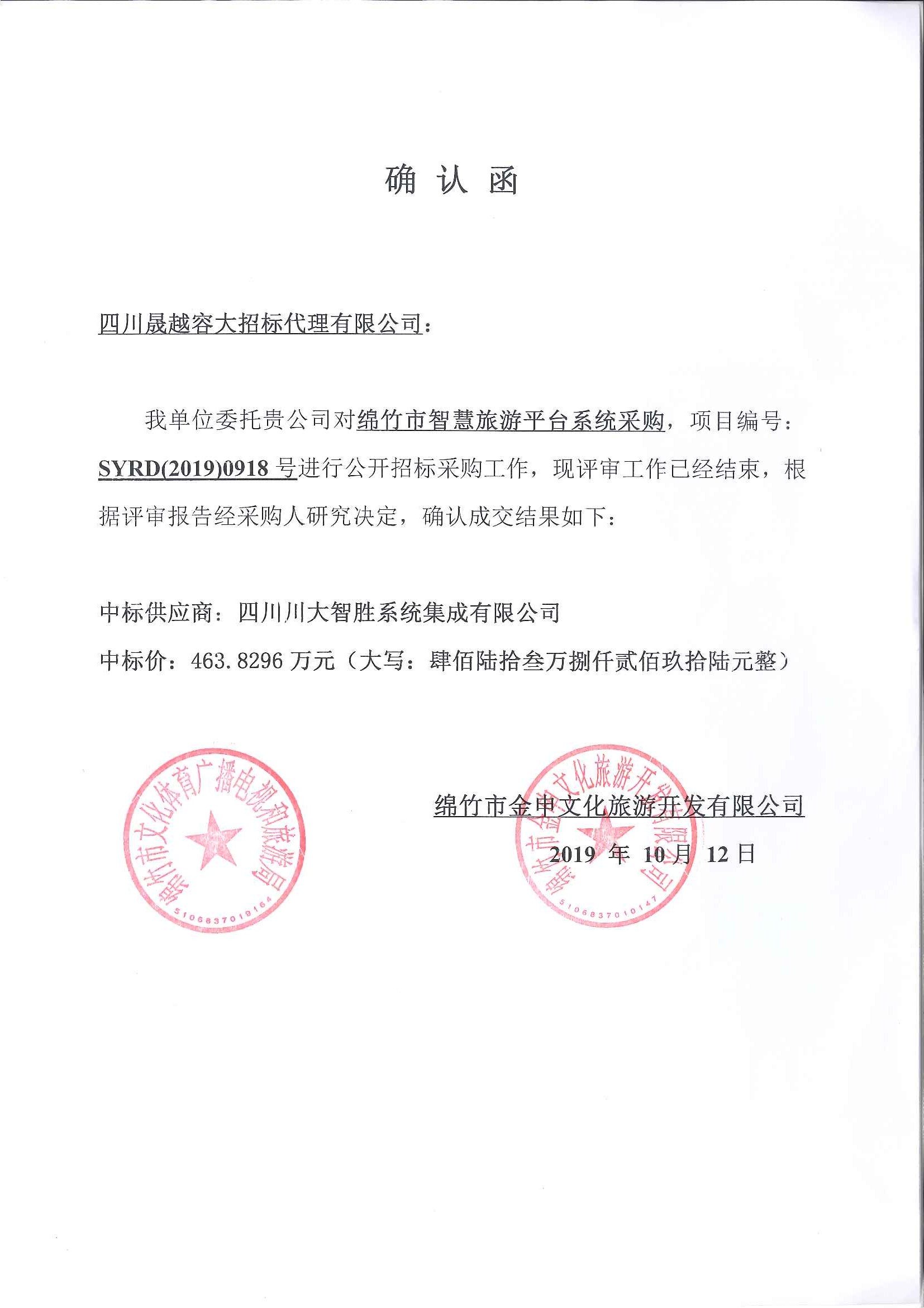 綿竹市智慧旅游平臺系統采購確認函