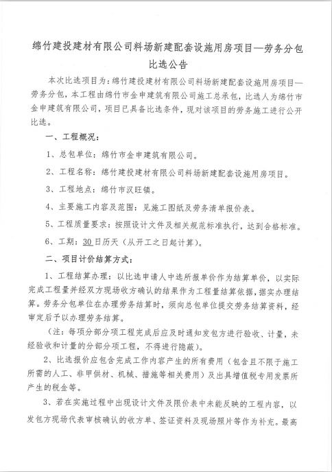 市建投建材料場(chǎng)新建配套設施用房項目勞務(wù)分包比選公告