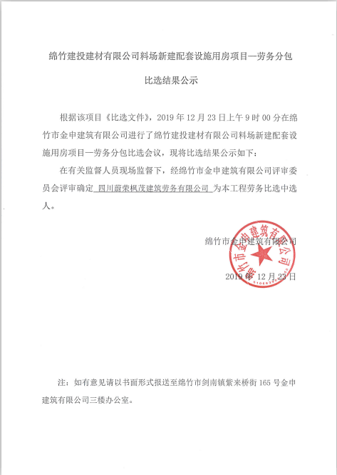 建投建材料場(chǎng)新建配套設施用房項目勞務(wù)分包比選結果公示