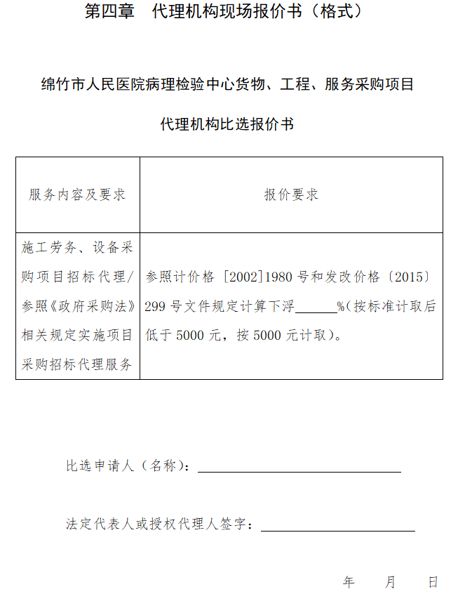 4.3定于報名截止時(shí)間,在自愿到場(chǎng)的比選申請人代表的現場(chǎng)監督下,在綿竹市金申建筑有限公司公開(kāi)舉行比選活動(dòng),從符合資格條件且報價(jià)(下浮比例)最高的比選申請人中確定 1 個(gè)代理機構作為中選人。